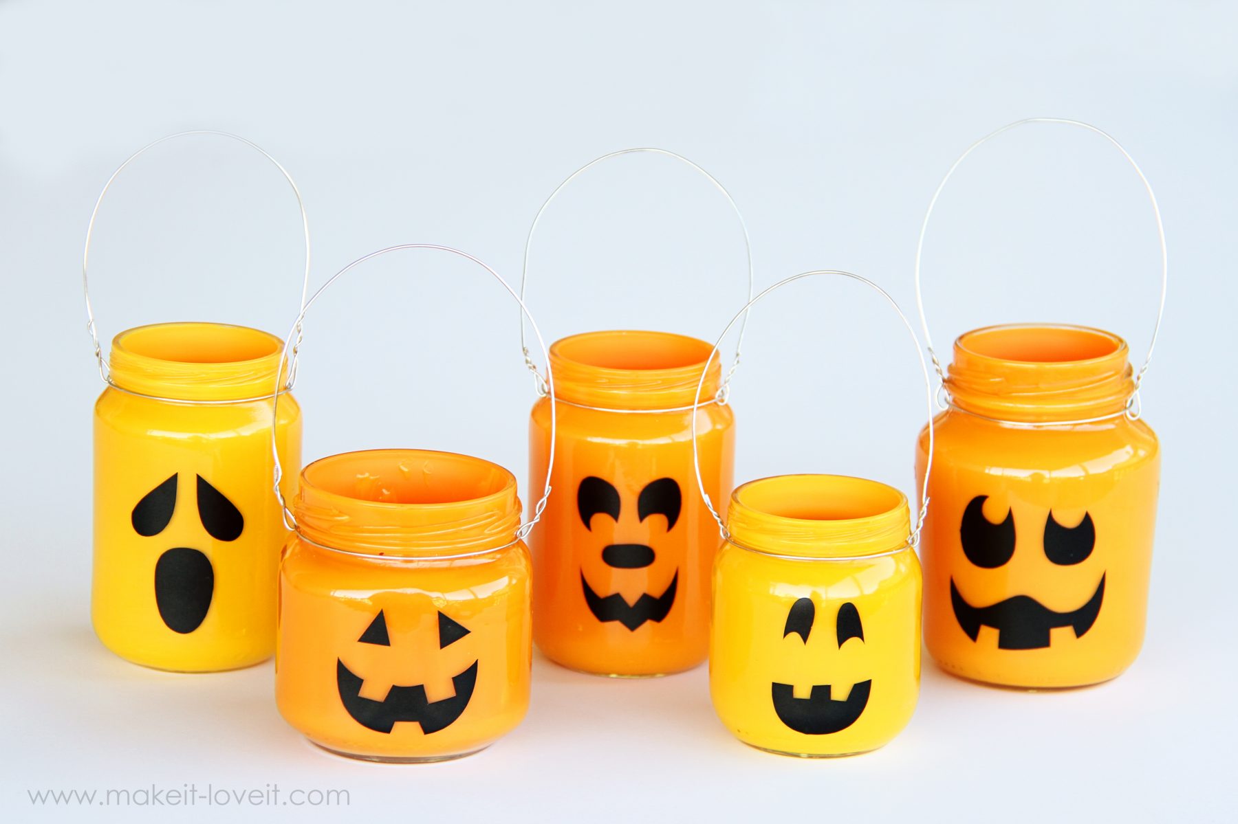 Now…..for the faces.  If you have a vinyl cutter (i.e. Silhouette) then you can use some jack o’ lantern images and cut them out for your jars.  If you don’t, you could always free hand some faces with a pair of scissors…….which would work just fine since jack ‘o lantern faces are always imperfect.  Or you can follow the technique shown by Martha.