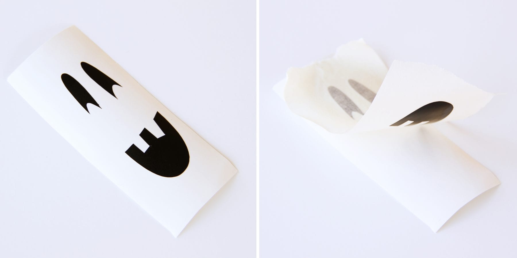 For me, I used my Silhouette and cut out my face shapes.  I peeled away the negative space (shown on left) and then applied some transfer paper (which is just like masking tape….just not as sticky) and stuck it to the top side (the non-sticky side) of my vinyl face.  Then I peeled back the transfer paper, which pulled the face with it.