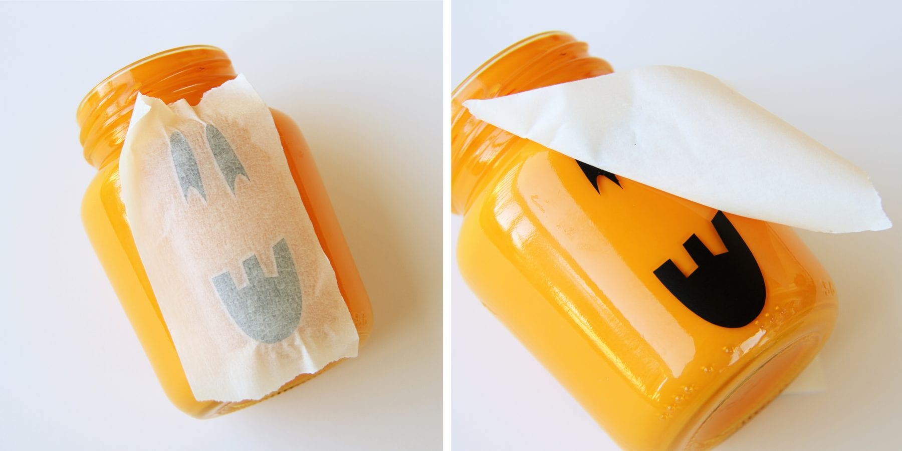 Then I centered the face on one side of the jar and pressed it down firmly with my fingers.  Then I peeled back the transfer paper, leaving the face behind.