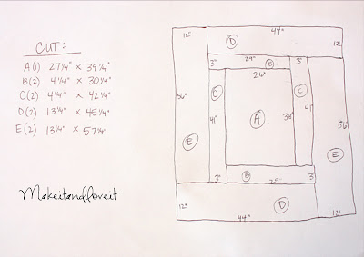 As you can see, I wrote the dimensions of each section, right there in each rectangle. Then off to the left, I wrote how many of each I needed to cut and the exact measurement, including a 5/8″ seam allowance on every side.