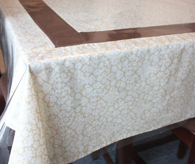 As a point of reference, my table is 3 feet by 4 feet. I wanted the tablecloth to hang off the edge about 10 inches. So the finished product is 56 inches by 68 inches. Also, in case you are altering these directions to fit your table………I wanted there to be about 2 inches of the patterned beige color on the outer ring of the tablecloth, if looking from the top. I didn’t want that brown color to go all the way to the edge. If you want it the same way, make sure to consider that before cutting.