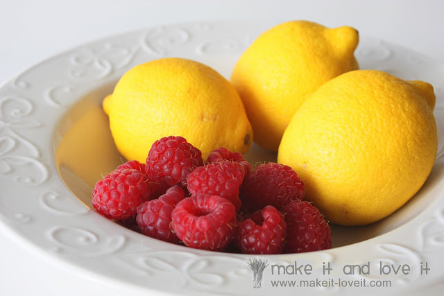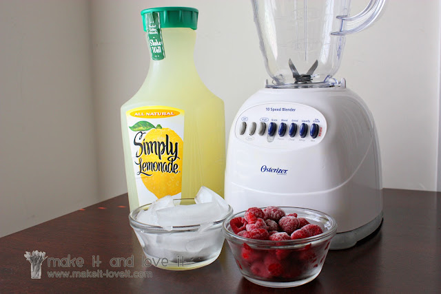 Simply Lemonade brand lemonade (real lemon juice, not from concentrate, seriously delicious), frozen unsweetened raspberries, and ice. Okay, and a little sugar if desired. Â