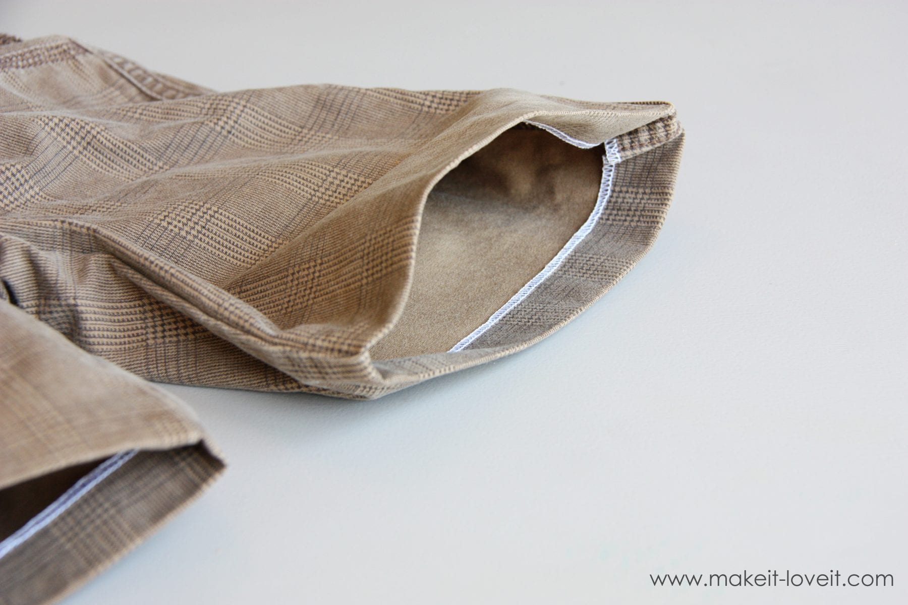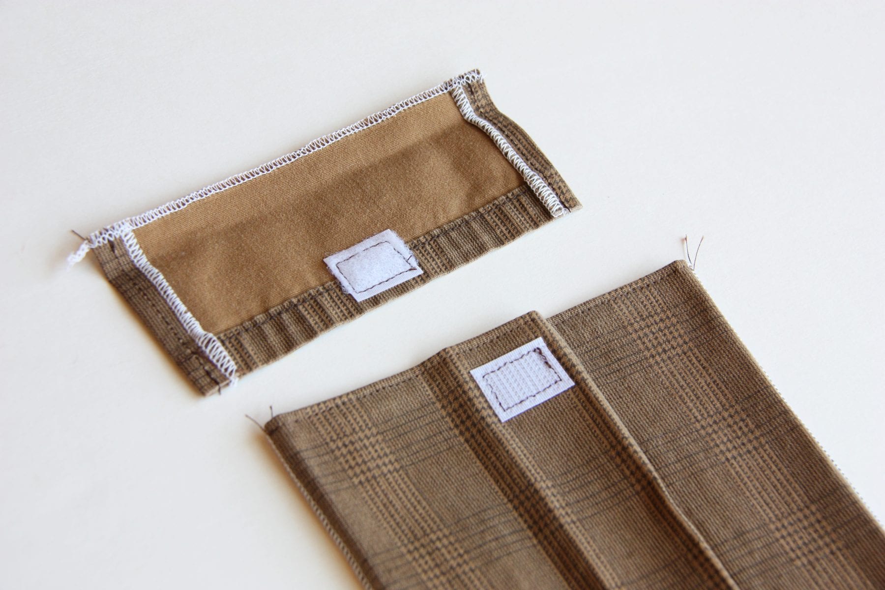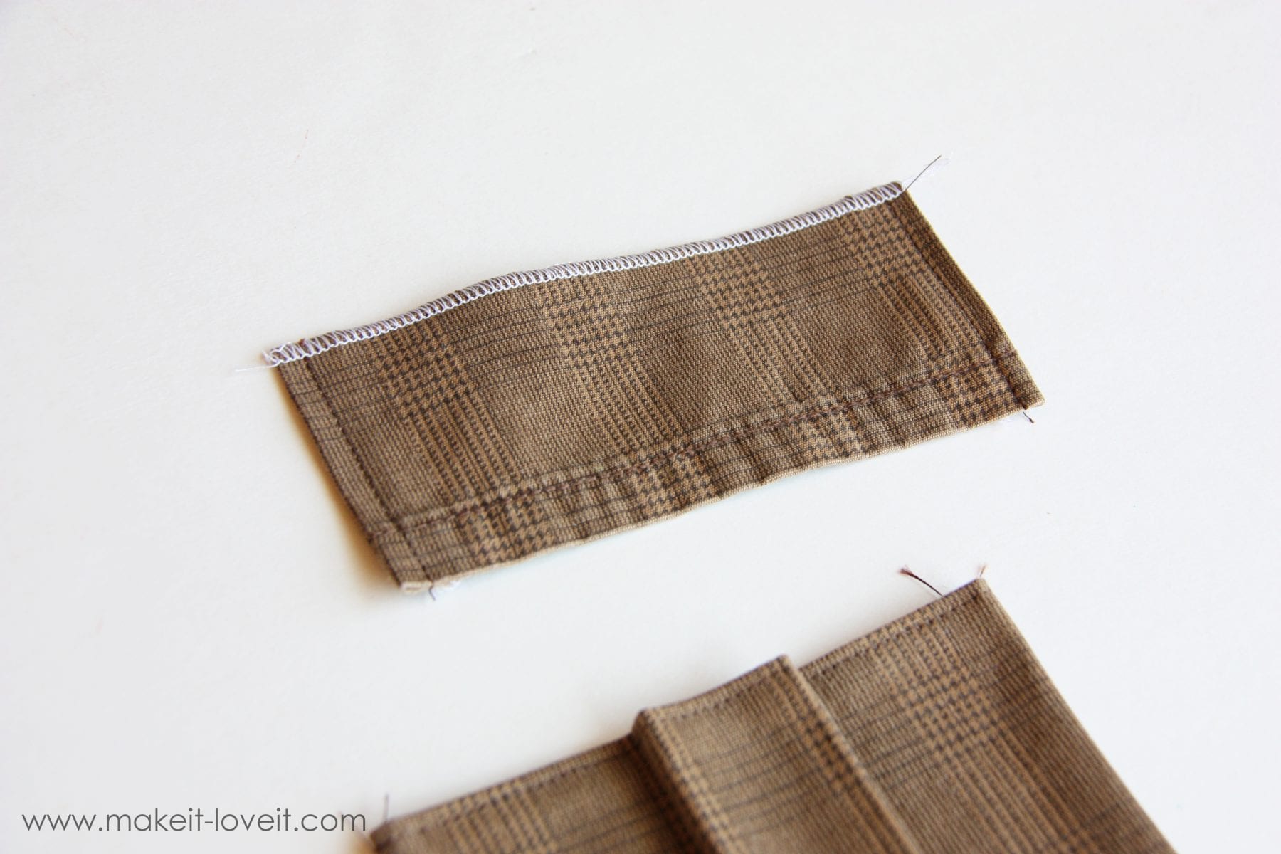 Next, cut another piece out of the leftover pant leg (about a 1/3 of the height of the pocket), to make a pocket flap. I made mine wide than my actual pocket, but that’s up to you. I also used the pant leg hem again to save me on hemming for the pocket. Serge the side seams and fold under a 1/4 inch.