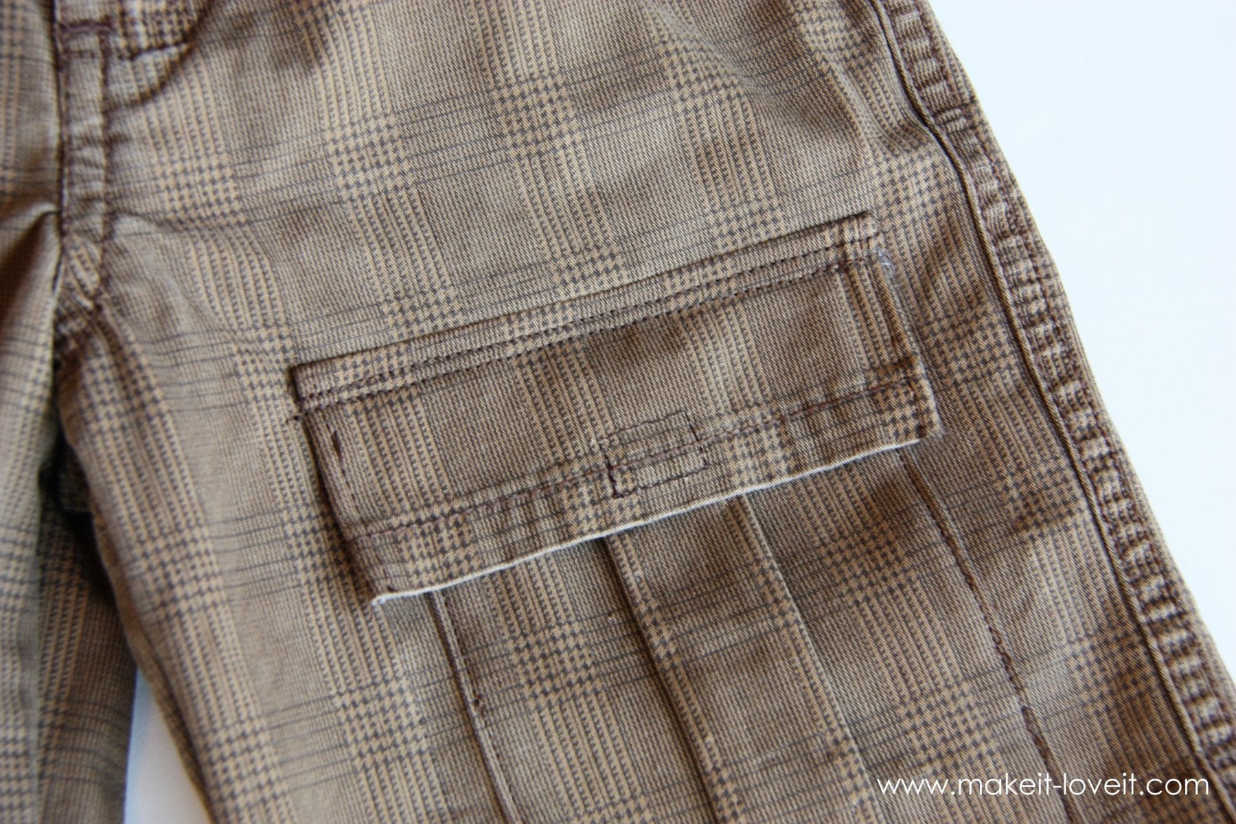Lastly, attach the pocket flap to the pants, right above the pocket, with right sides together. Sew near the bottom edge of the flap.