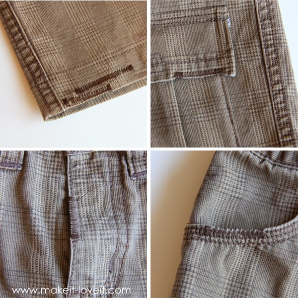 To begin, find an old pair of pants that are too short for your little guy (or nephew/grandson/neighbor).
