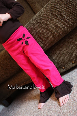 Nice and comfy pants……at no cost to me. I used the same pattern as the pants here. But this time I cut out a flower shape and added a ruffle.