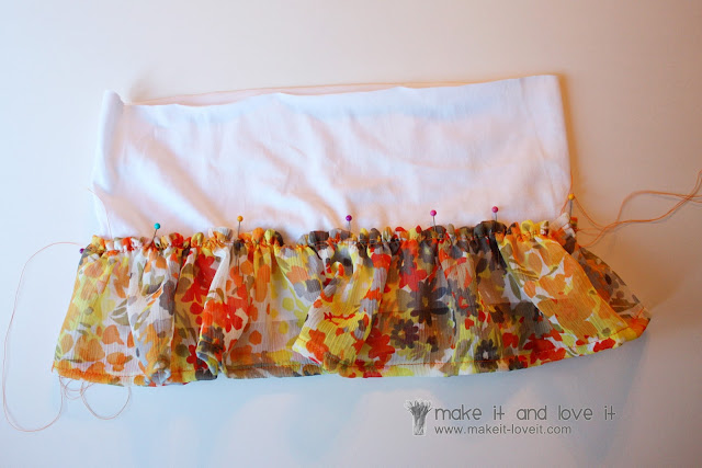 here.) Then gather each ruffle in until it’s the same width as your lining tube. Attach each ruffle to the lining, using pins to keep them in place. Allow the bottom ruffle to overlap the bottom of the lining by about an inch.