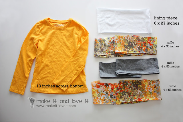 The yellow shirt was 13 inches across the bottom, so 26 inches all the way around. I tried the shirt on my little girl and decided that I wanted the shirt to extend 6 more inches, to just about reach her knees.