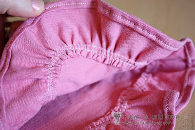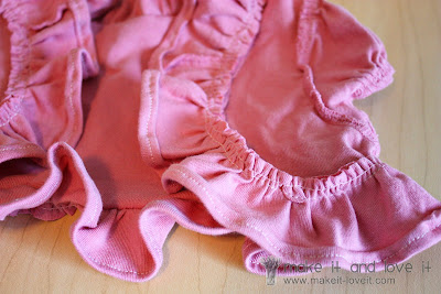 Then I gathered and evenly spread the fabric until it was the same length as the outer edge of the shrug. And then I pinned the ruffle to the outer edge of the shrug, with right sides together. (Need help with gathering? Click