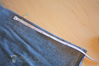 Then I measured 8 inches up from the end of the sleeve and marked it with the pin. Make sure you mark opposite of the seam of the sleeve, that goes under the arm. You want the strip of fabric and the snap to be placed on the side of your arm.