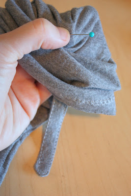 I lined up the seam of the sleeve and the seam of the little tube of fabric and pinned it all the way around the inside of the bottom of the sleeve.