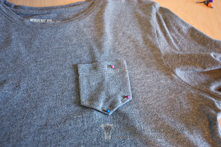 Then try your shirt on and see where the pocket would look the best. Try to pin it in place, take of the shirt, and add more pins as you adjust the pocket to make it even and balanced on the shirt.