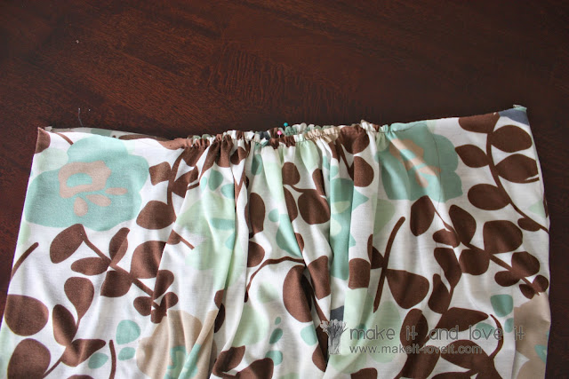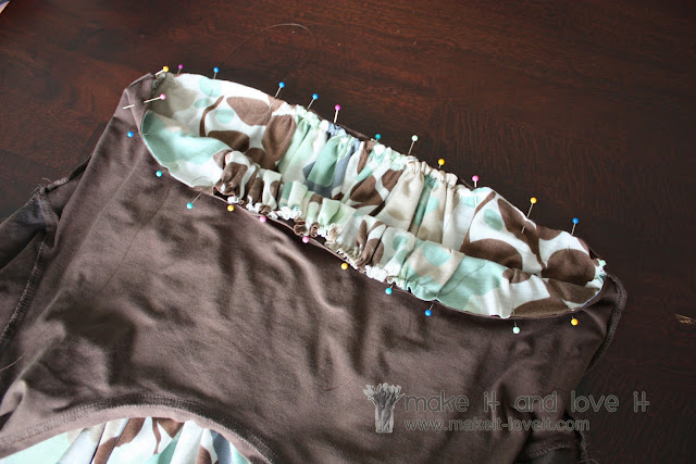 Then adjust your gathers to fit evenly along the raw edge of the shirt. Pin both pieces together with plenty of pins.Â