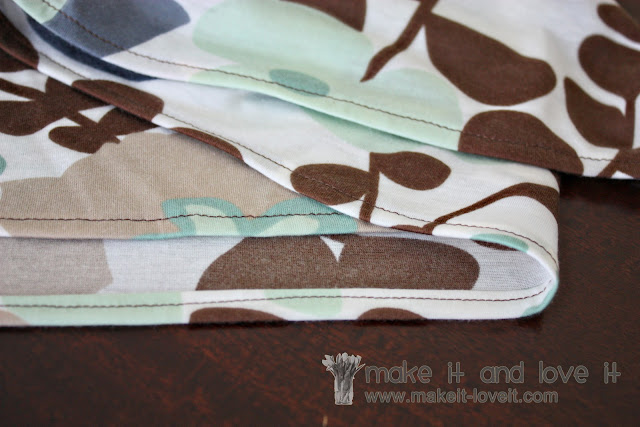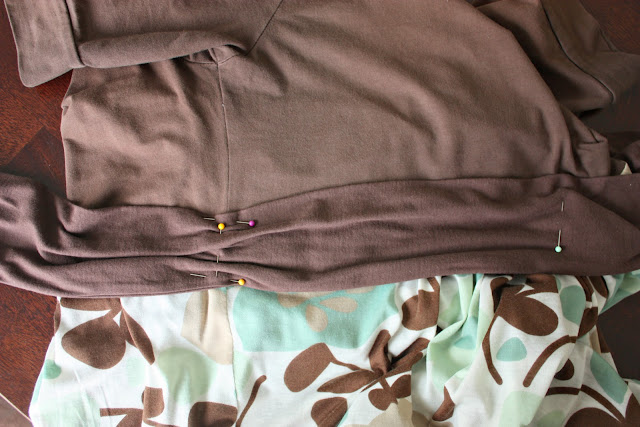 First, you’ll need a more fitted knit shirt from your closet (start digging) and a few yards of coordinating knit fabric. (Or head on over to store and grab an inexpensive one…) Or try color blocking some nice solids together. That would be cute too.