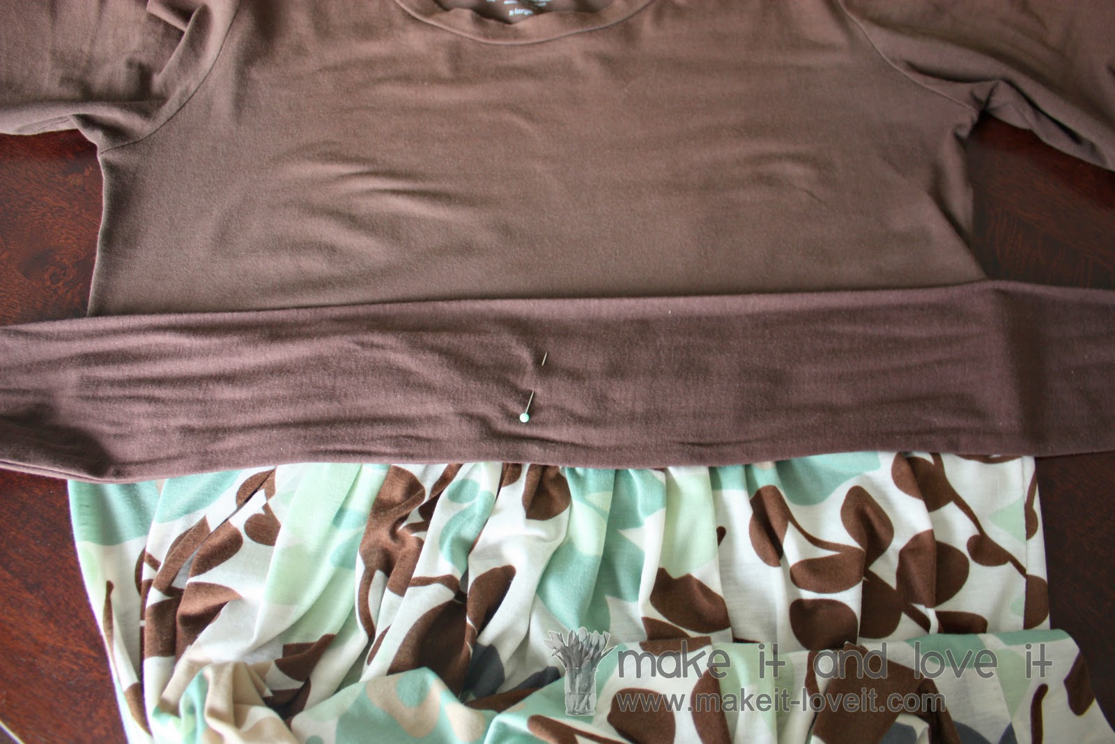 Then, I turned the shirt inside out and upside down and slid it down over the skirt section, matching up the side seams and the center pins on both sections of the dress. Make sure that the front section of the skirt is matched up with front of the shirt and the back with the back.
