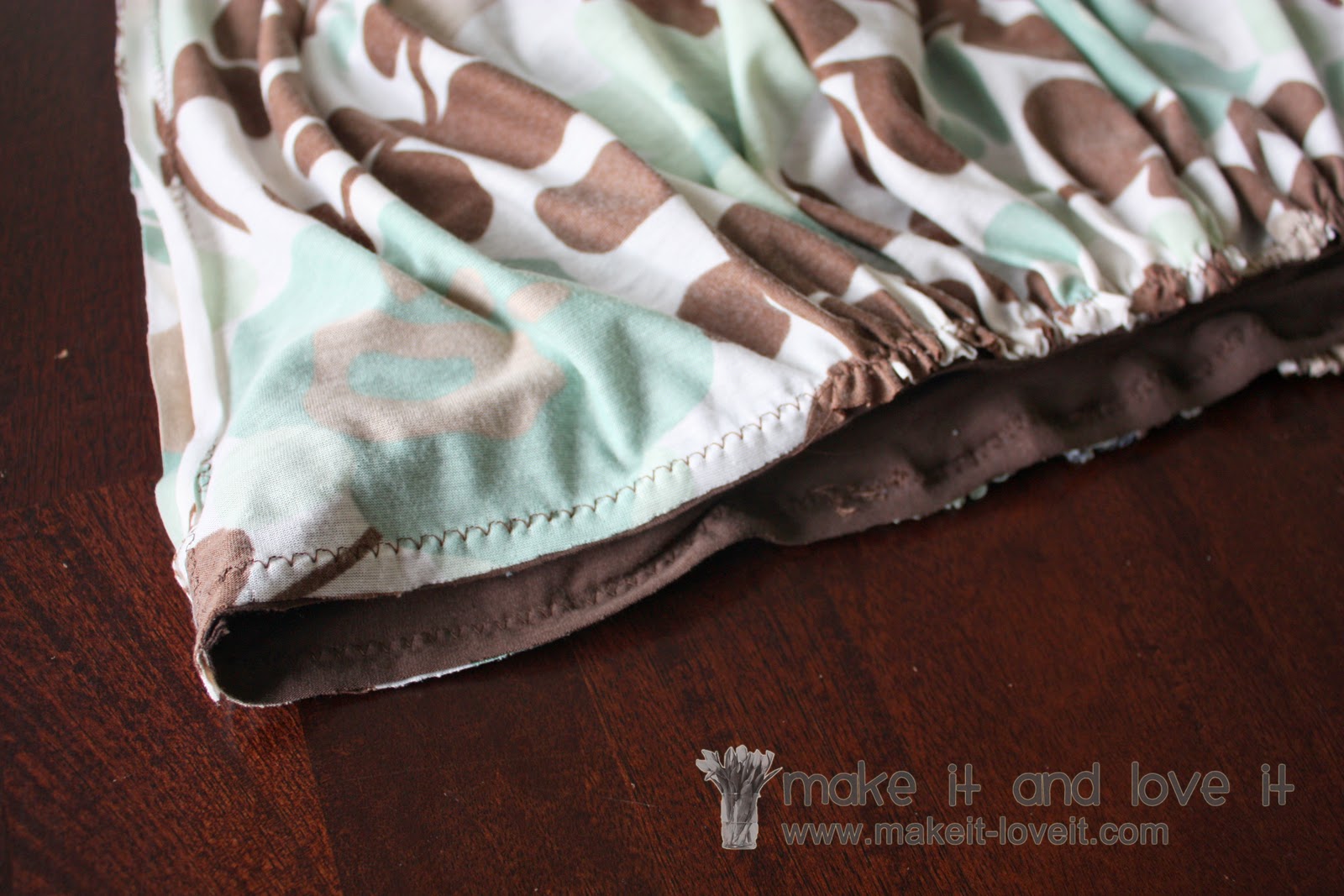 And at this point, you can hand sew little tacks to hold the tie in place along the front……or just adjust after you get it on. I didn’t hand stitch anything in place because knit isn’t slippery at all and the tie should stay in place and all ruched for you without any problem after you have it pulled and tied in the back.