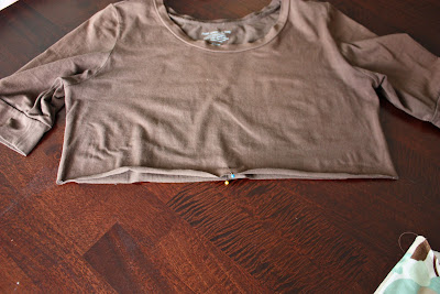 Then try on your shirt and mark with pins where you’d like the empire-waist-seam to hit on you. Then cut the shirt off a 1/2 inch below that.