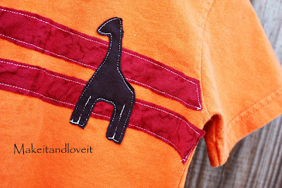 I did the same thing here…..but just cut strips for the stripes and sewed them on first. Then I cut a little giraffe (no, not a dinosaur) and sewed him on next.