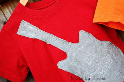 Then I drew it on paper, cut it out, traced it onto some knit, and then cut that out. Then I pinned it to the Tshirt and then sewed around the entire guitar. Then I used chalk to draw some of the details on the guitar and then sewed over top of them….being sure to back-stitch at the beginning and end of each line.