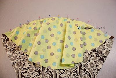 Next, I placed a pin at the center of both curves, where they will be sewn together. (If you click on the picture, you’ll see the pins.)