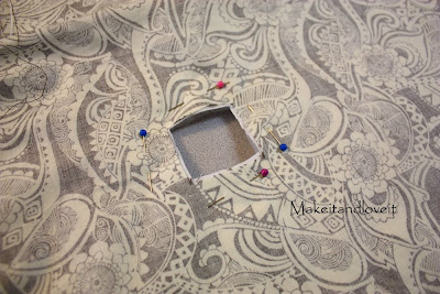Then I laid the original cover over my new one to mark the hole for the highchair to poke through. (But cut the hole smaller to allow for a seam allowance.)