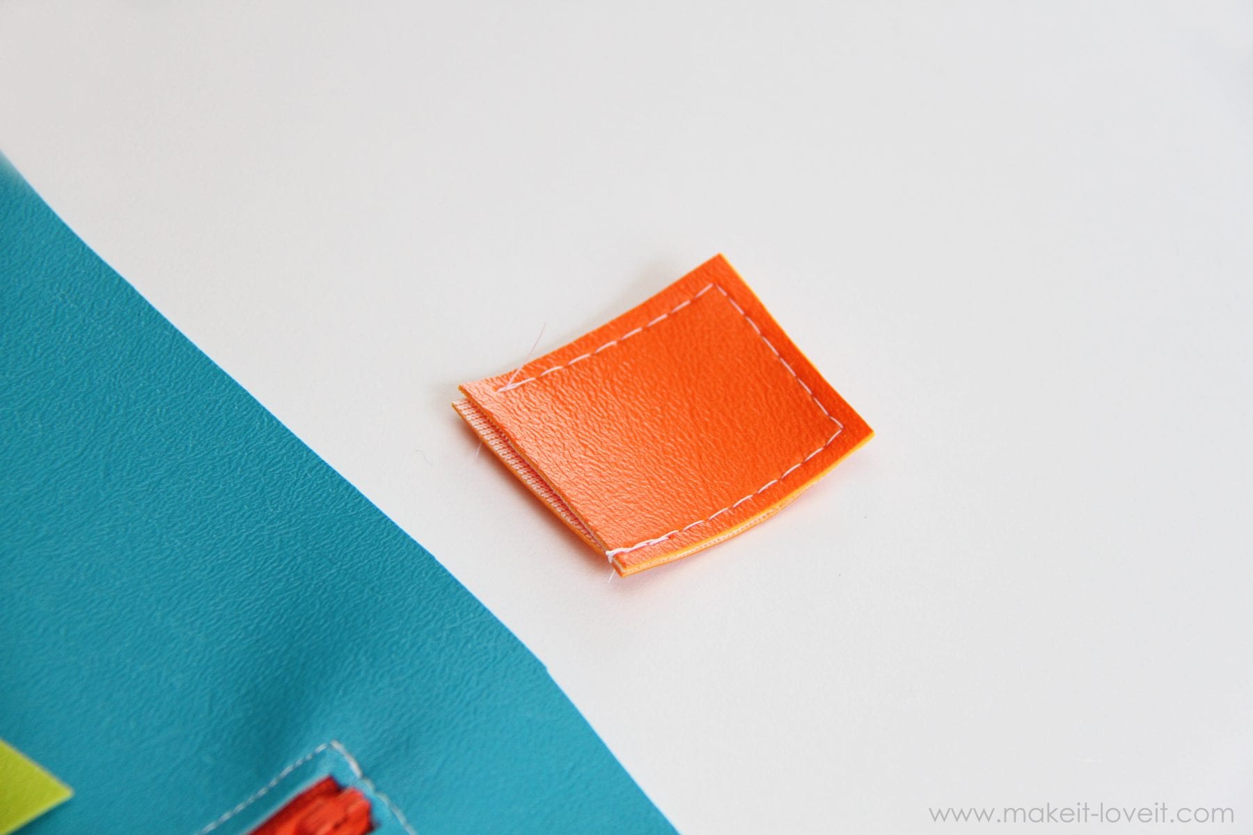 Then, I added my zipper just like the link above (but this opening is about 1.75 inches from the bottom edge and measures 7 inches wide by 1/2 inch tall). Then I cut some pieces of vinyl in different colors to create the knob on top, the squares on the side, and then the eye background section in the middle.