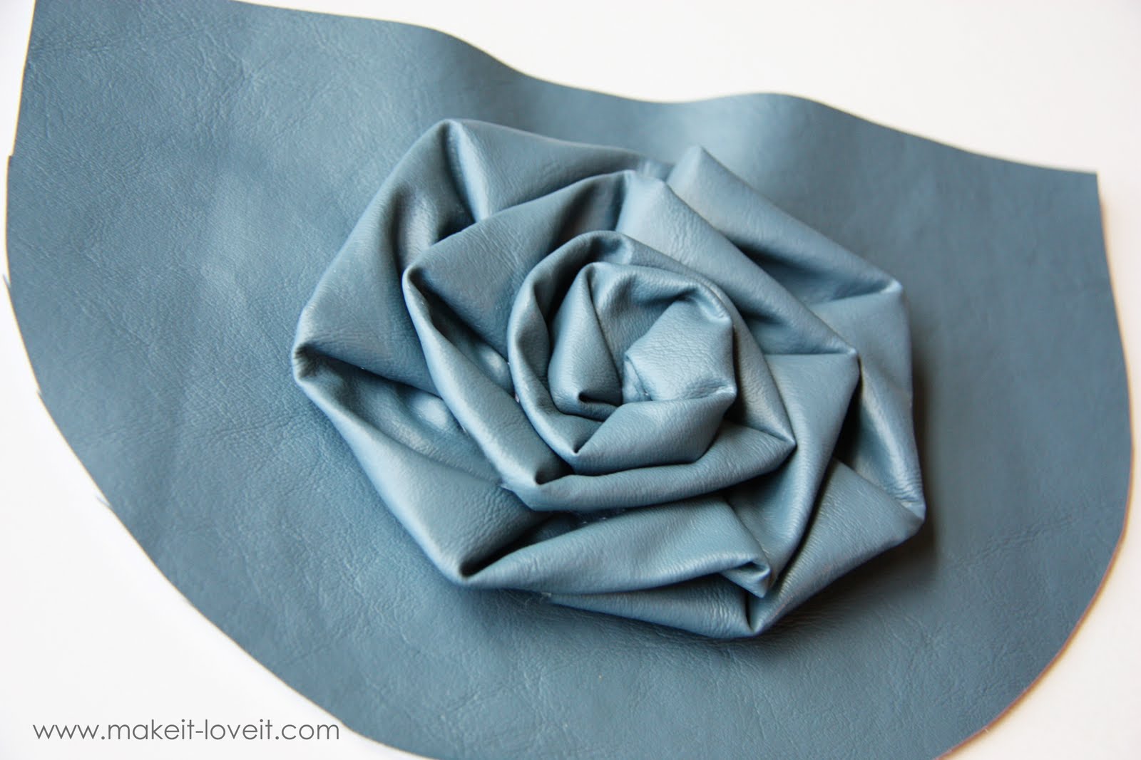Don’t worry about pinning and measuring…….you just need it to be pleated a bit so that you can circle the fabric around to make the flower shape. (If you’re using a thin cotton as your flower, you could gather the fabric and circle it around in the flower shape……but this vinyl is too thick to gather.)