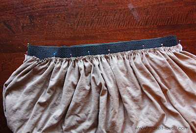 Gather evenly, so that it’s the same width as your elastic.  Then pin the skirt, while it’s inside out, to the “wrong side” of the elastic.
