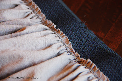 Gather evenly, so that it’s the same width as your elastic. Then pin the skirt, while it’s inside out, to the “wrong side” of the elastic.