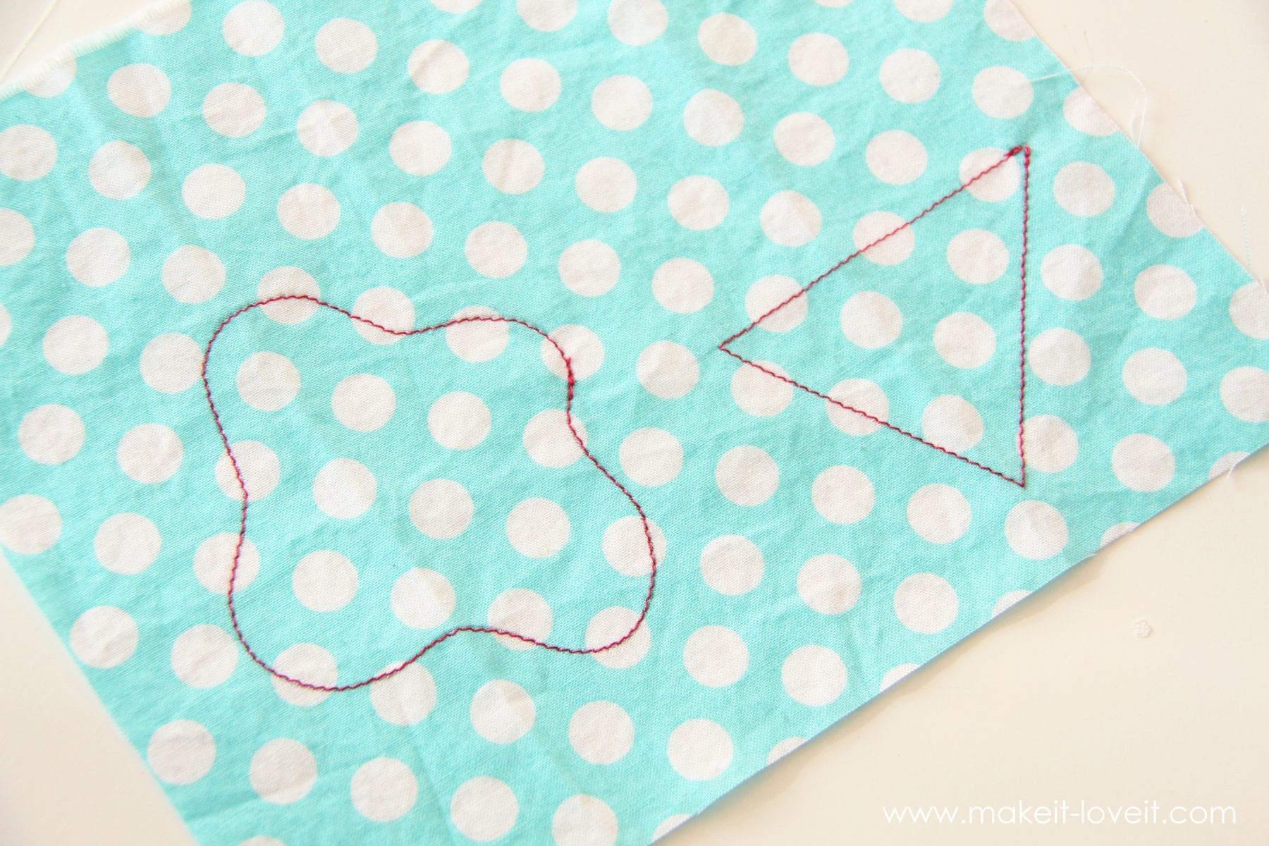 After you get nice and comfortable with those straight lines, sew around random shapes on your fabric, or draw some on your fabric. WIth curves, you can’t sew as fast……so ease up on that foot pedal. And as you sew, you may have to lift up your presser foot, readjust your fabric, and then continue on. When I sewed that cloud looking shape, I only sewed 2-3 stitches and then readjusted my fabric and then sewed 2-3 more………all around those curves. So, take your time!