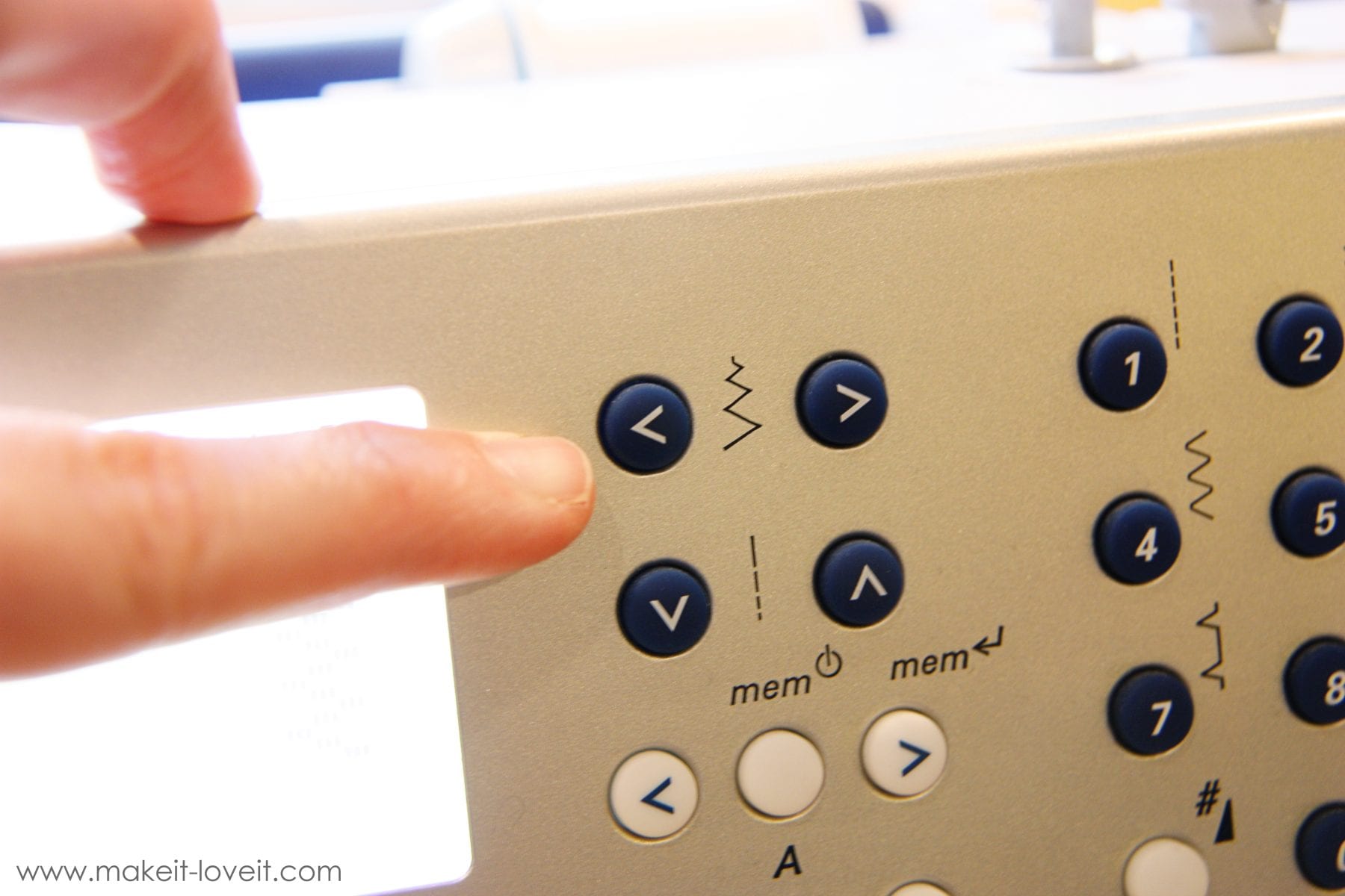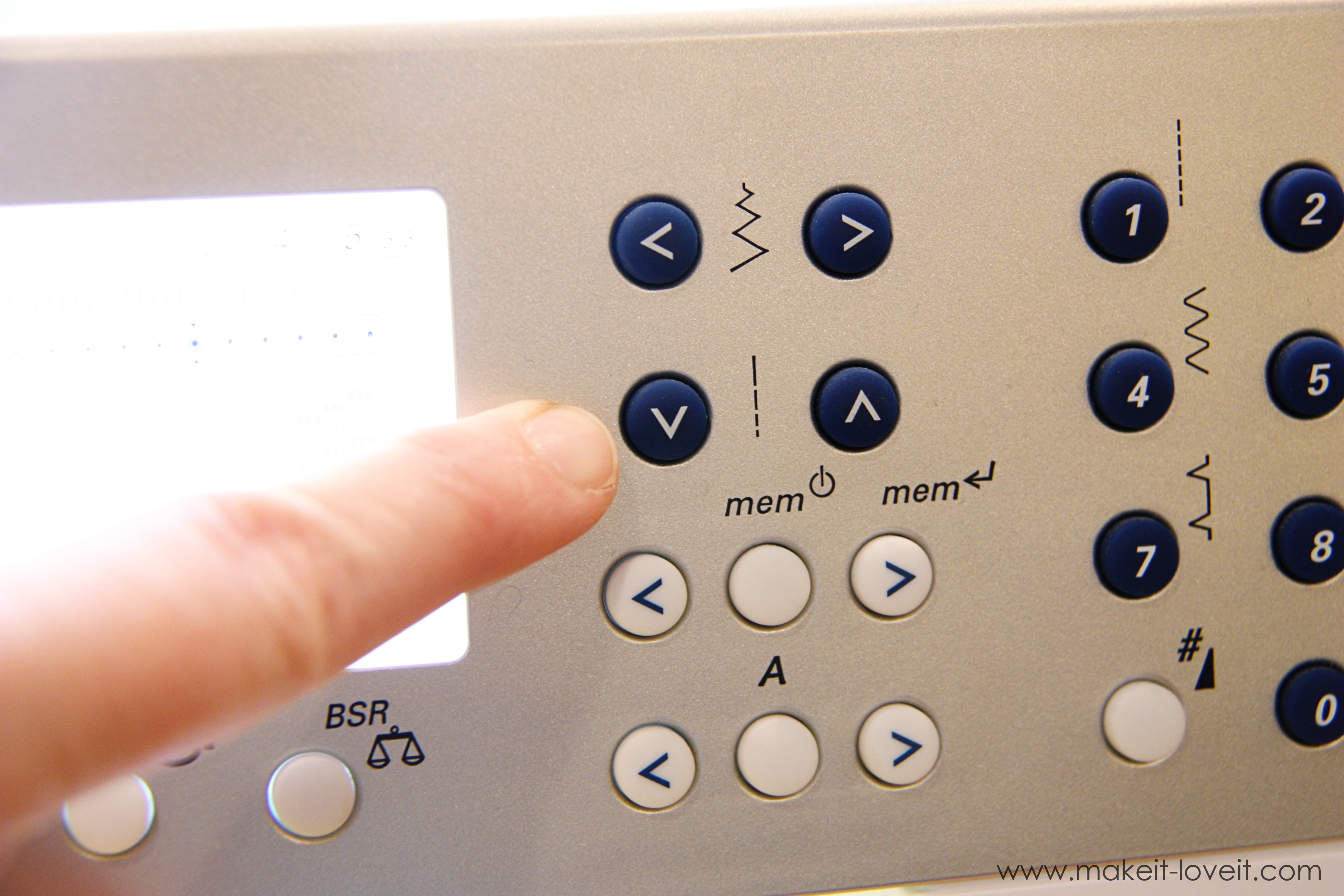 Then lower the needle right down into the hole, and lower your presser foot, and then sew (with the pedal) 4 or 5 or five stitches.