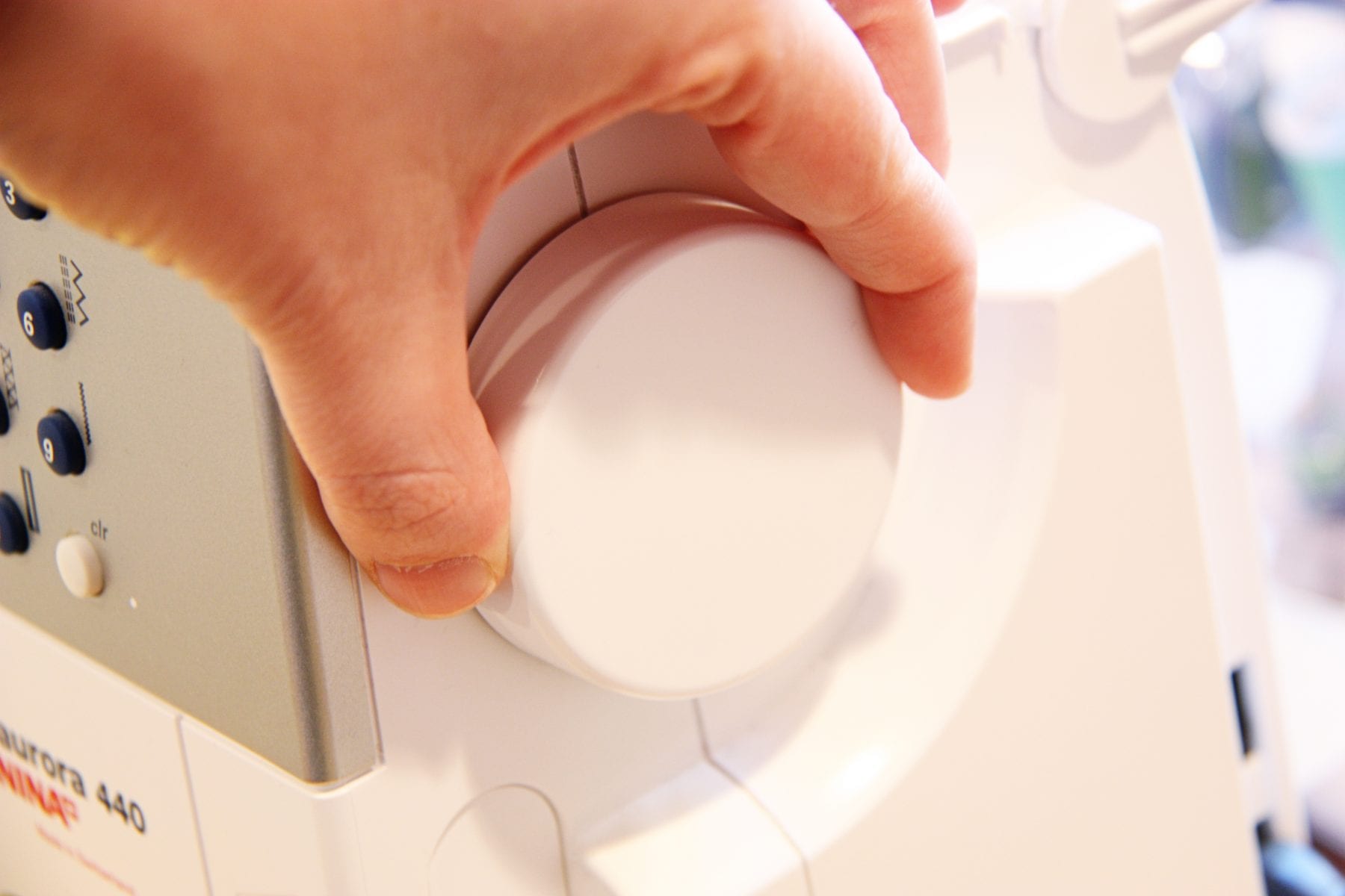 But for this technique we want to de-activate them (or drop them down) so they aren’t pulling on the button.  Look to see if there is some sort of lever or button to drop the feed dogs down.