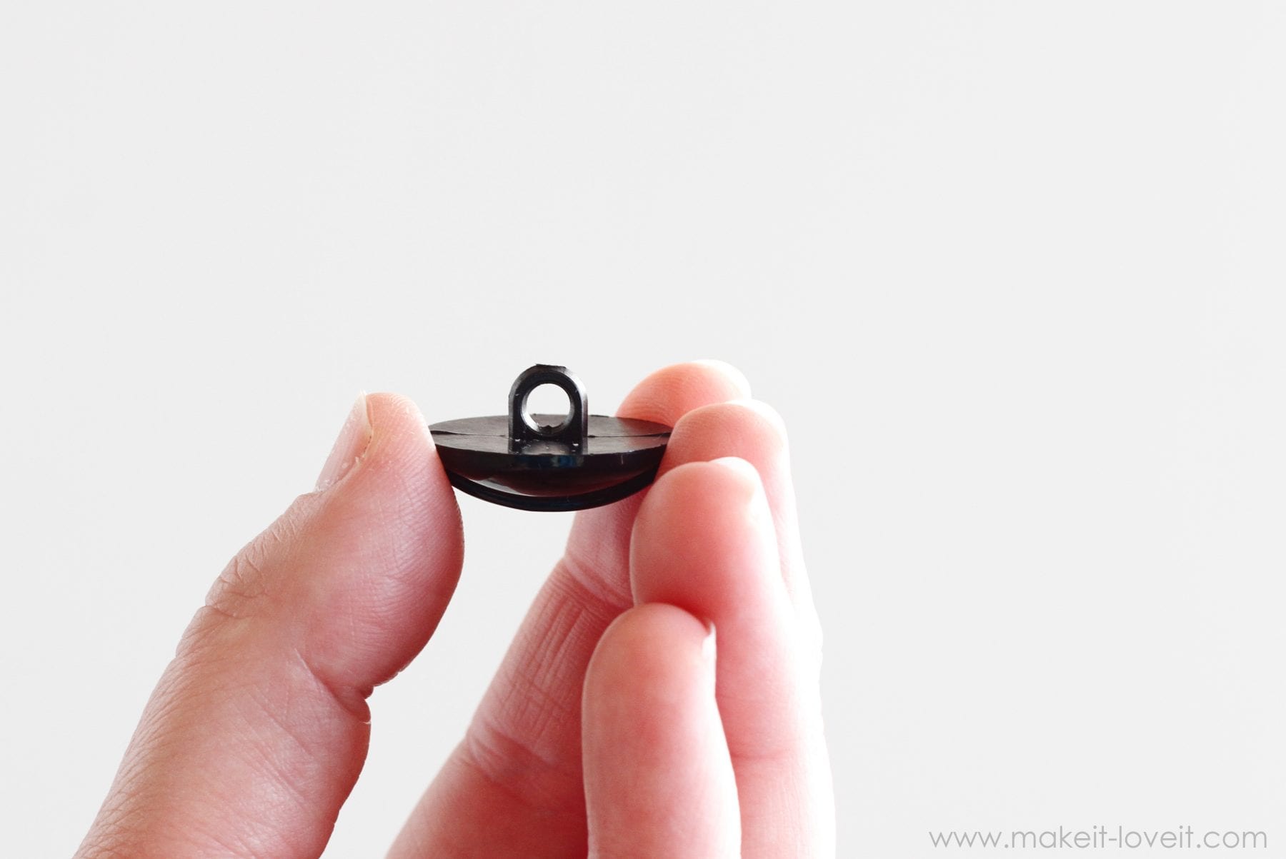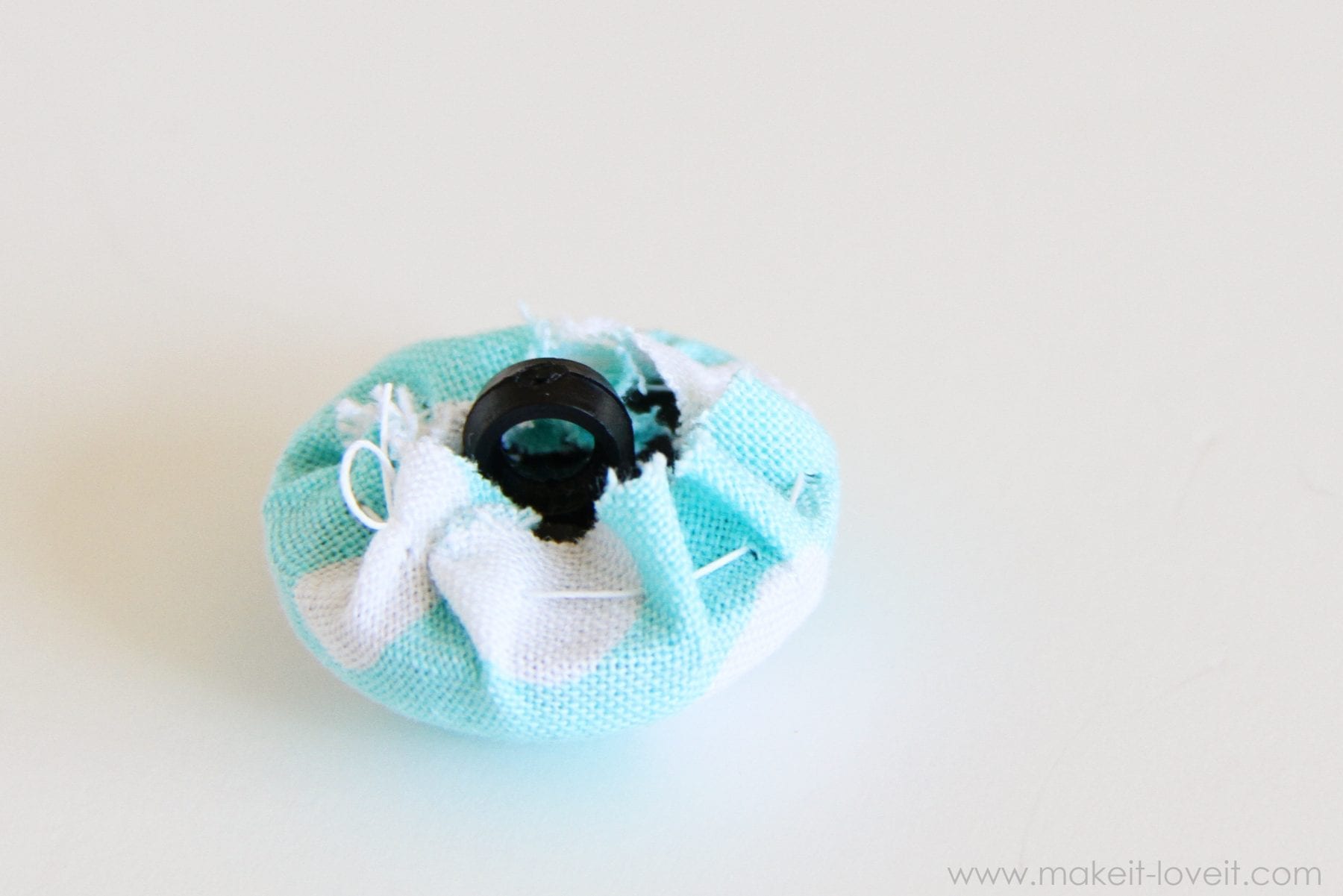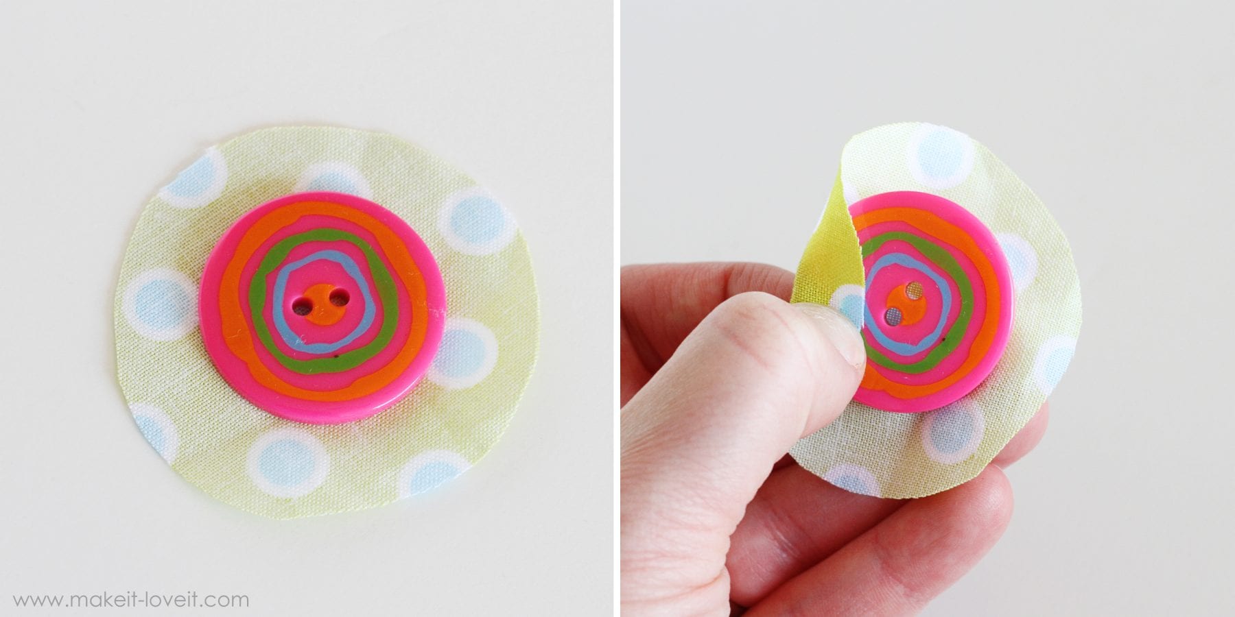 And if your button has some texture on the front that you don’t want to show, cut out a piece of felt that is the same size as the top of your button. Then lay it down on the fabric before putting your button on there.
