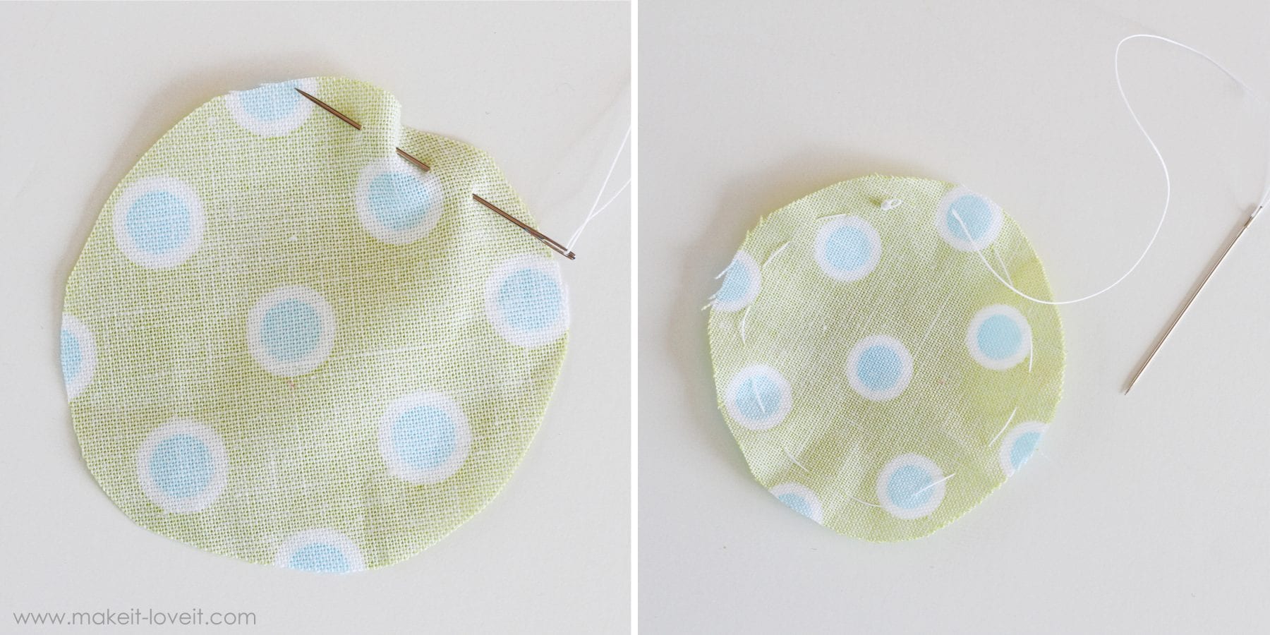 Then, if you’ve ever made fabric yo-yo’s, the next step is the same. You knot your thread and start weaving your needle in and out of the outer edge of your circle (on the wrong side of the fabric), until you make it all the way around the circle. The smaller your weave, the better the outcome. The bigger your weave, the messier it will look when you cinch it in.