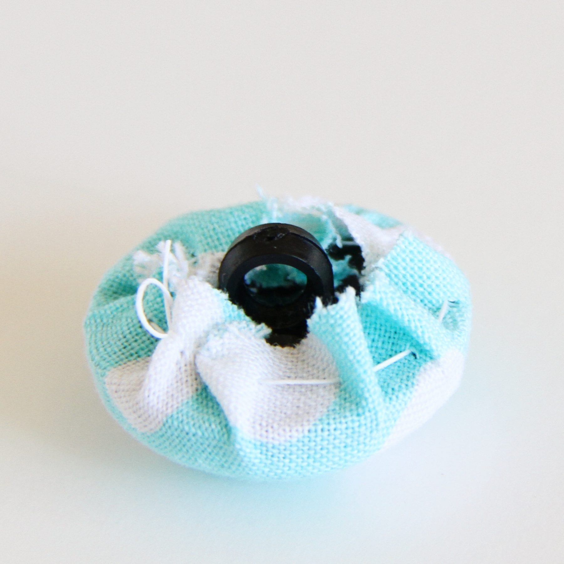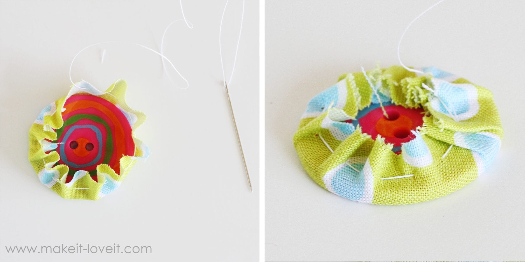 Place your button back in the center of your circle, then pull your thread. It will cinch right around the button, creating a nice cover for it. Knot the end, keeping the cinched in fabric nice and tight.