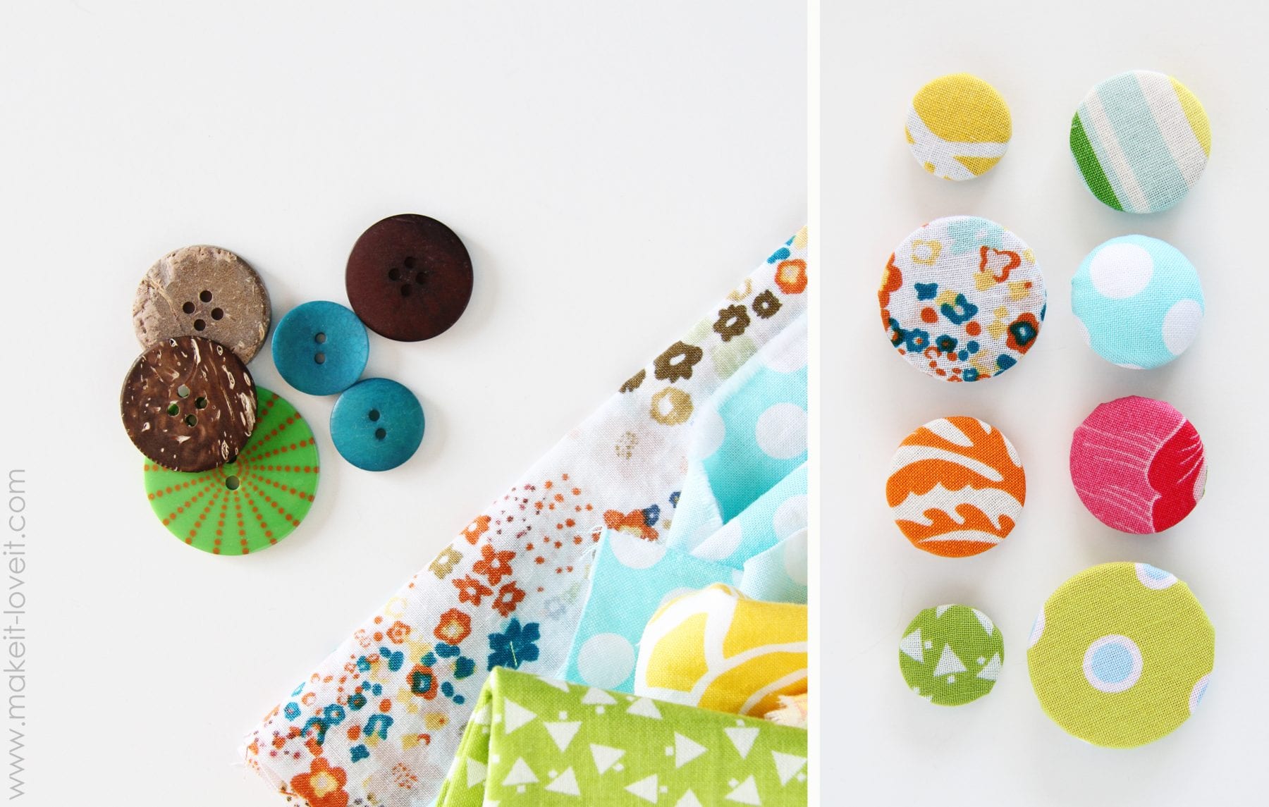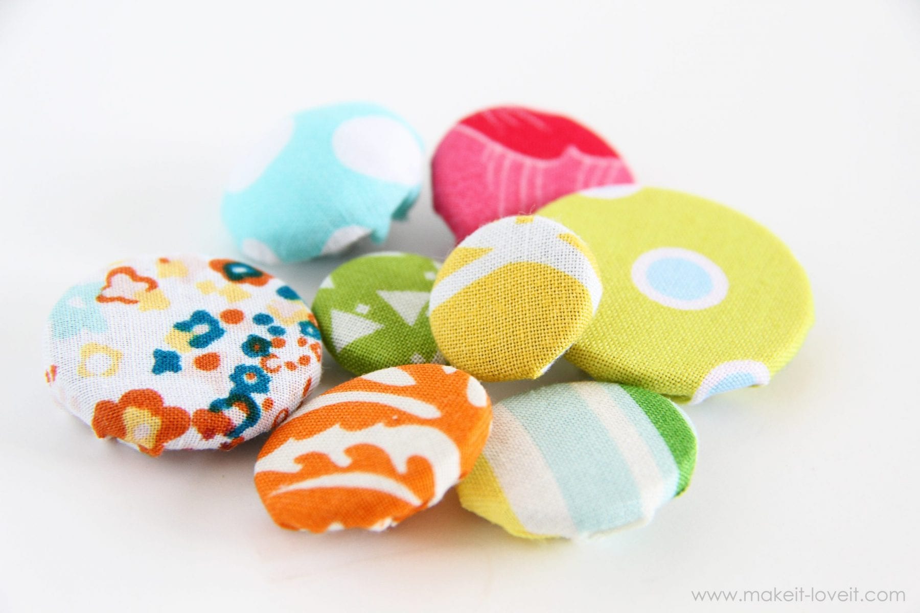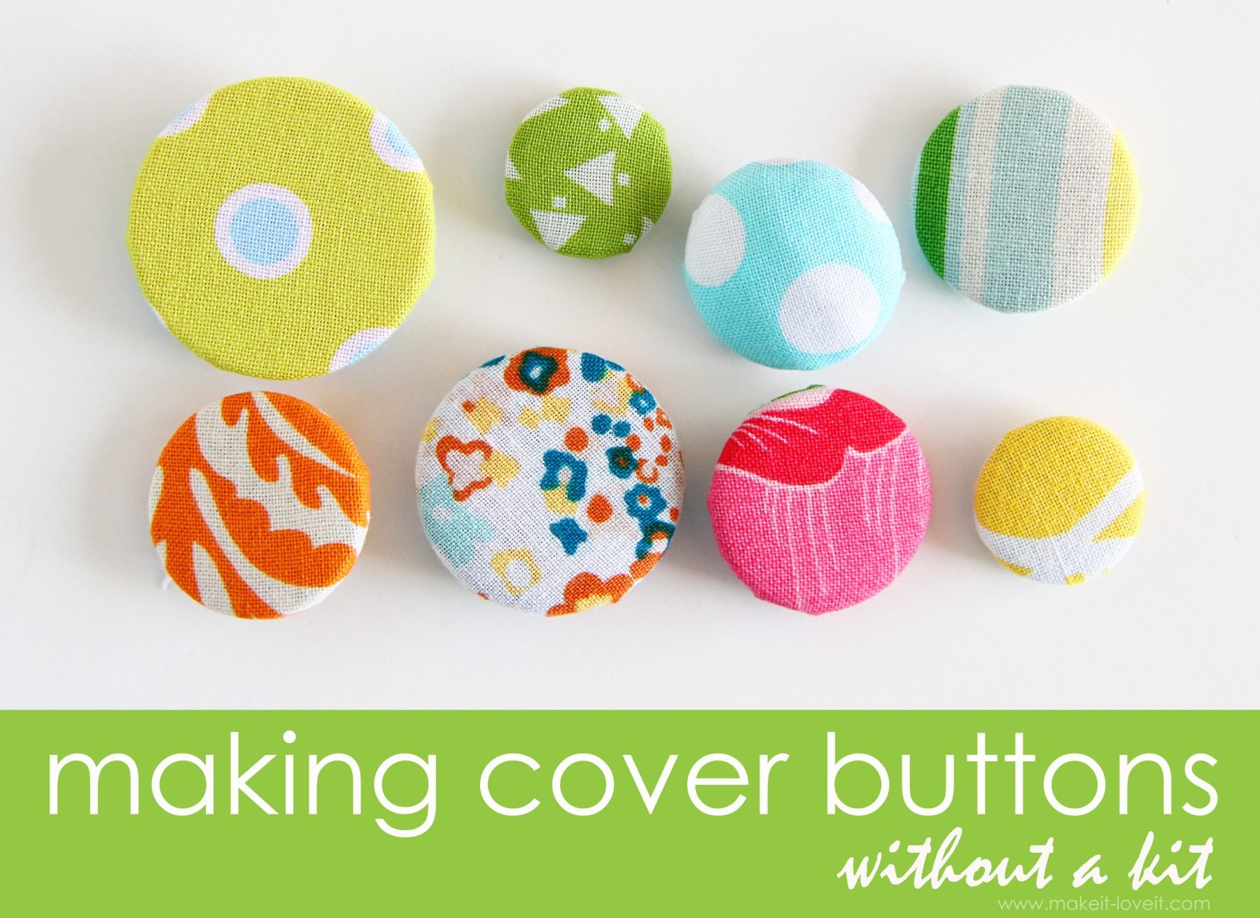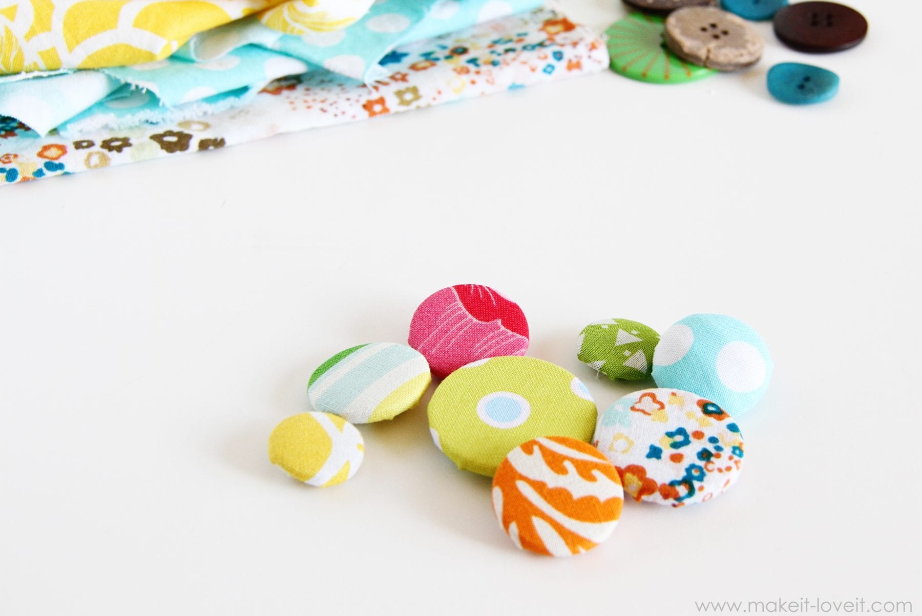 Use fabric scraps and your button stash. Or buy a handful of the “Odds ‘n Ends” buttons, at the fabric store. Or purchase some cheapy-cheap buttons at the store. The price of cheap buttons cost much less than the cover button kits.