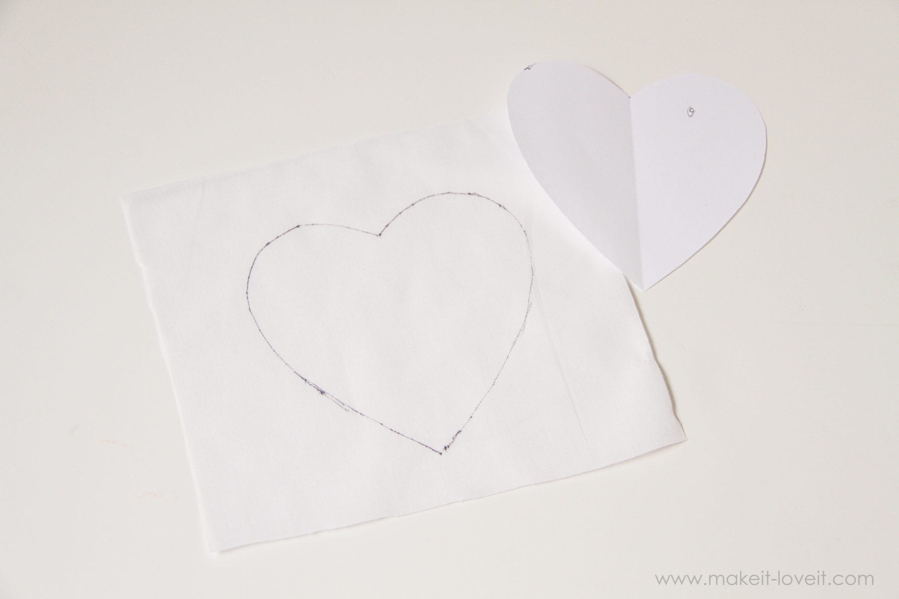 Now, cut a heart out of paper to the size of shaggy heart that would look best on the size of dress you’re making/using.  Trace that heart onto a square of woven cotton fabric (because it’s sturdier and doesn’t stretch), making sure to have a few inches of space around all edges.