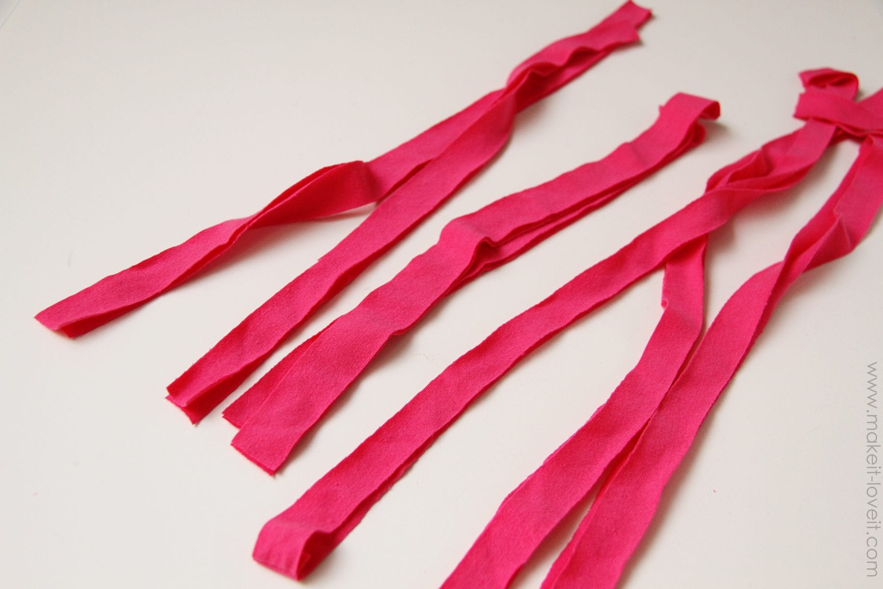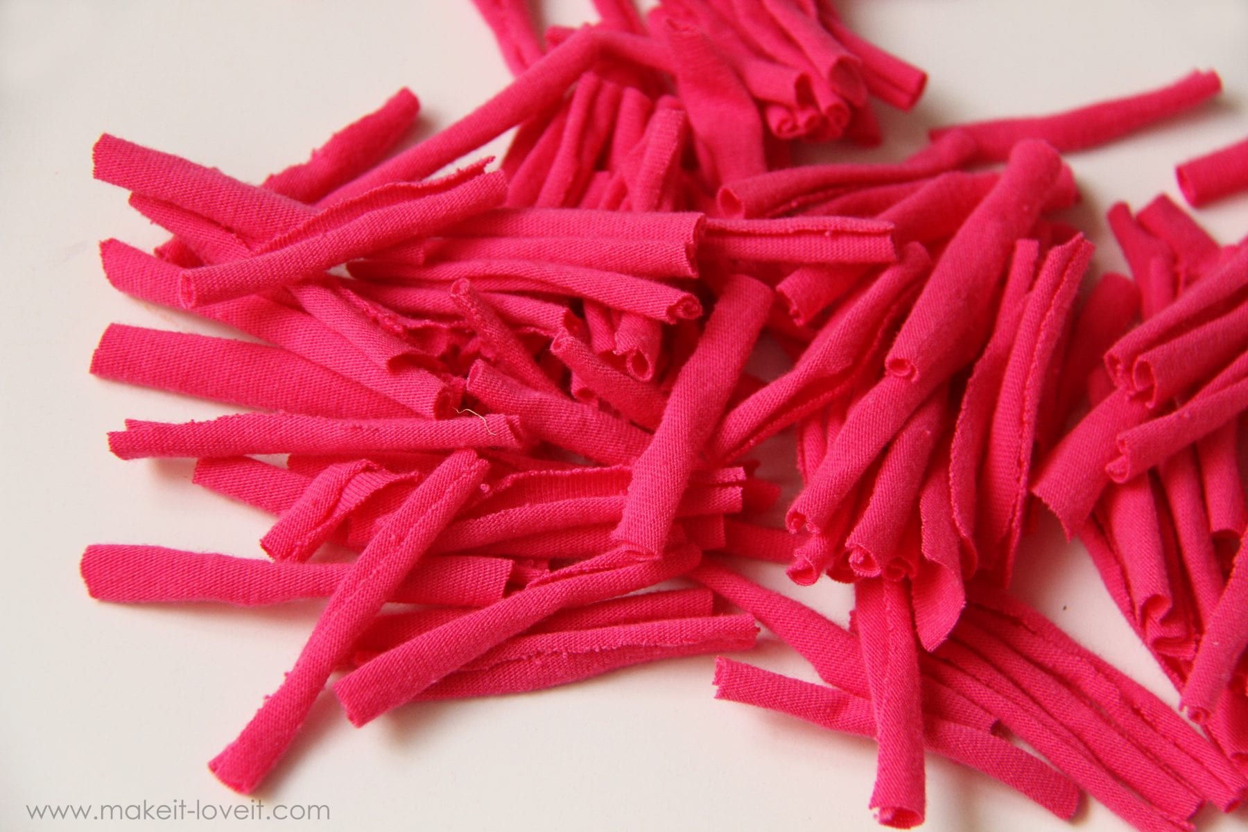 Next, cut some strips of knit from your jersey knit Tshirts……cutting across the Tshirt so that the long strips stretch left to right.  I cut my strips about 1 inch wide.  (Be sure to visit this post, for more tips on selecting your Jersey knit shirts to work with.)