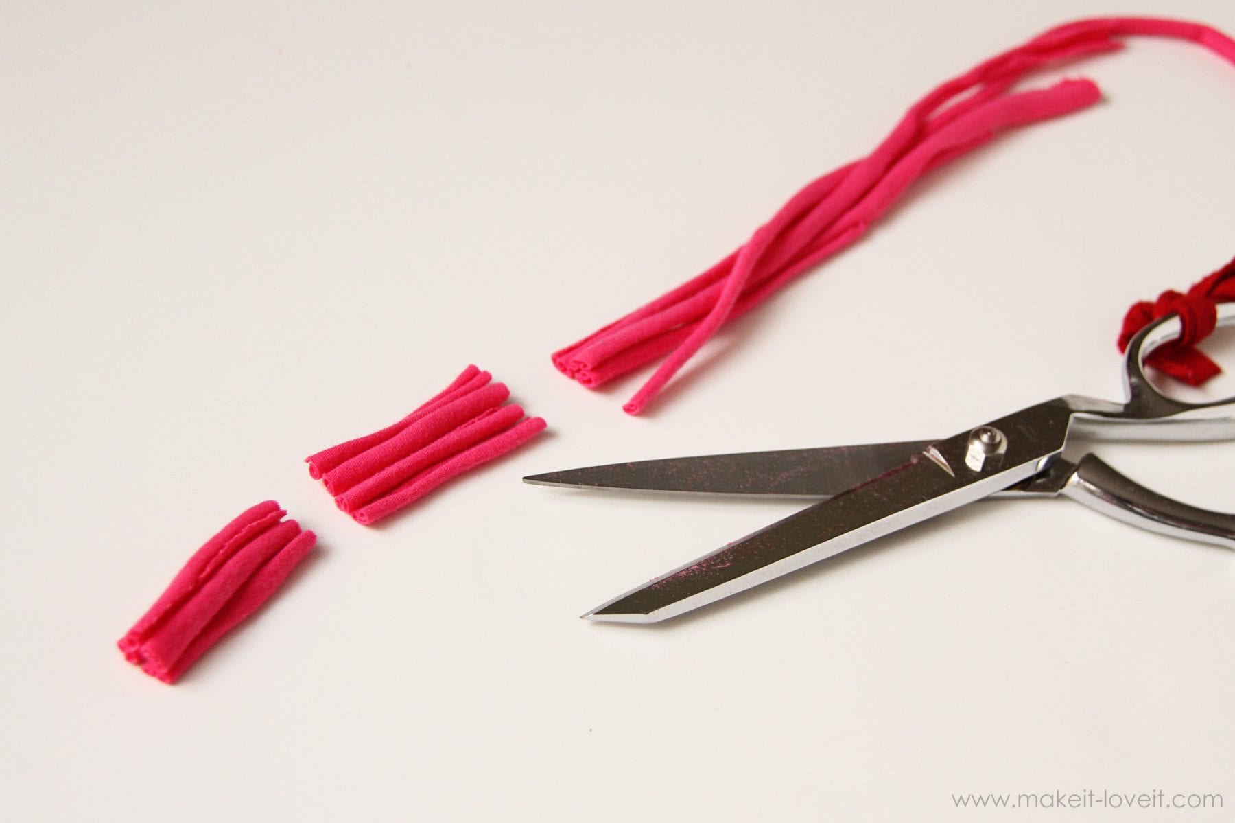 First things first, cut out your dress pieces from an old women’s jersey knit Tshirt…..using the old collar and hem of the shirt as the collar and hem for your new dress, if you can.  (Need more info on making your own dress? Click here.)  Or you can also add this shaggy heart to a dress/shirt that you already have.