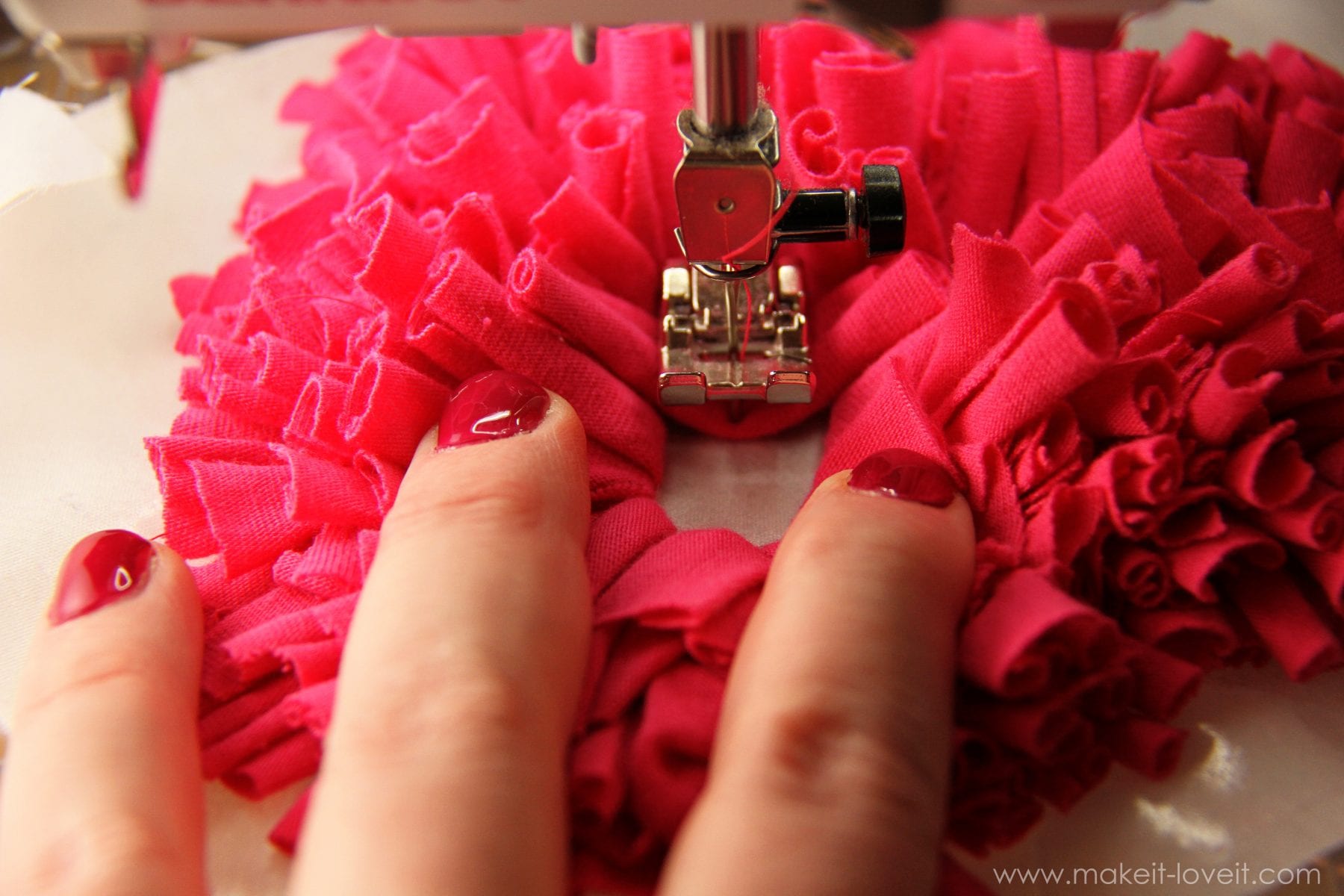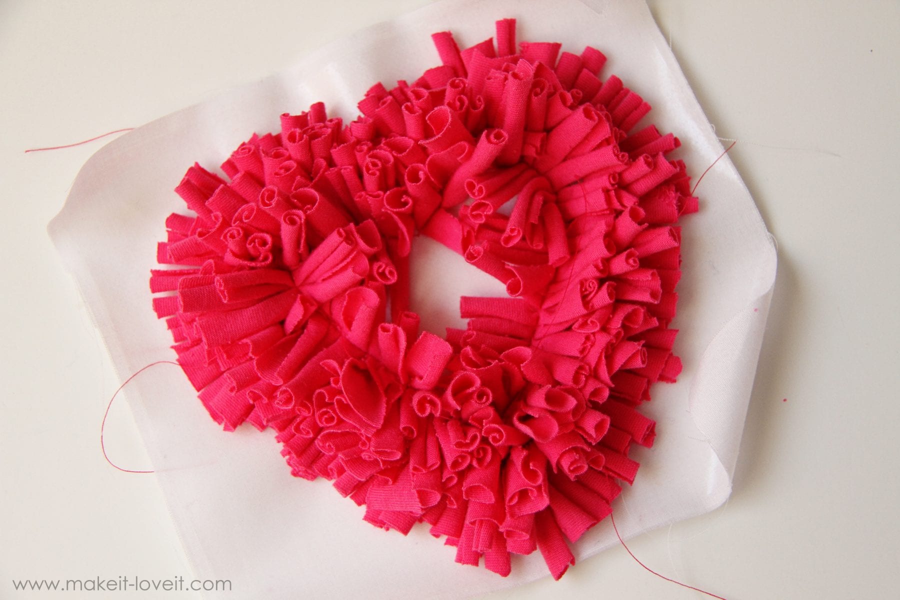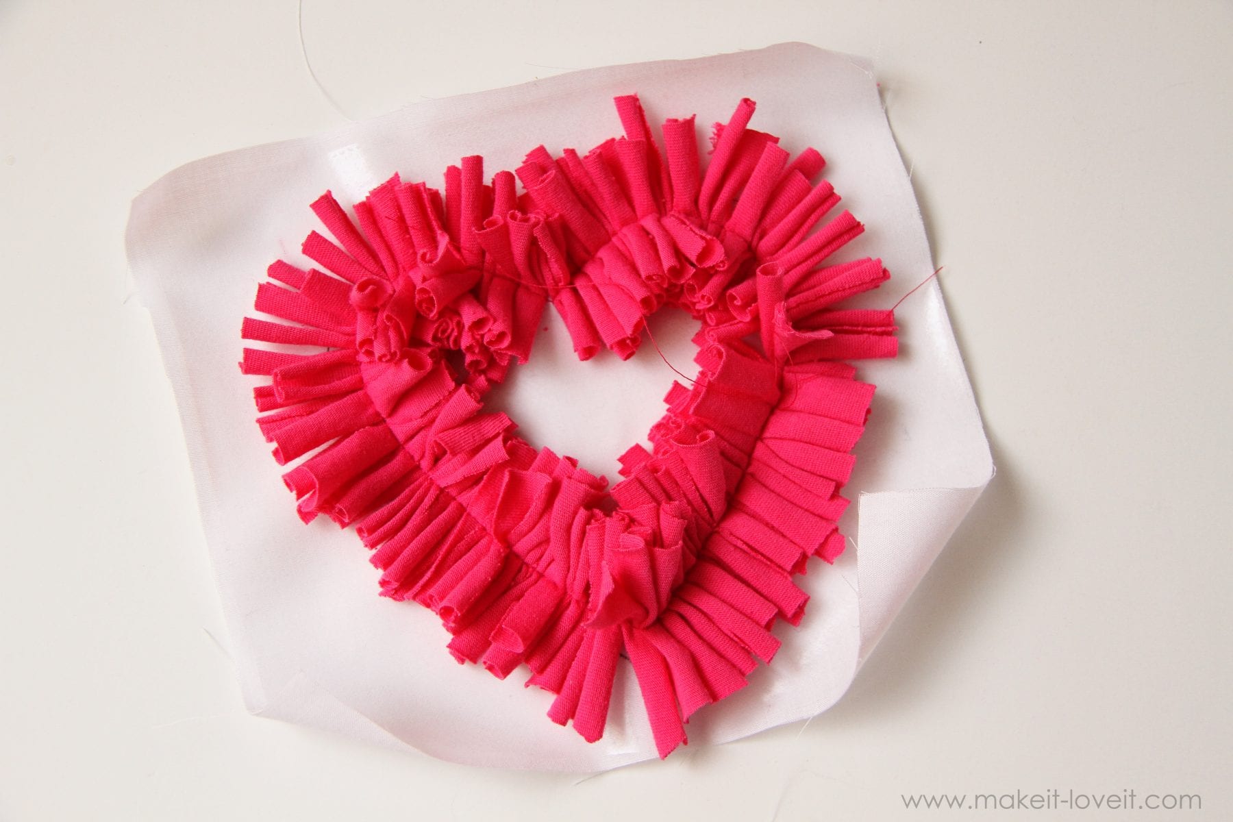 Then place about 3-4 of your little strips under the sewing machine needle at a time and sew them to the inside of the heart.  Make sure to sew those little pieces right down the center, keeping your needle about a 1/2 inch away from the pen mark of the heart that you drew.
