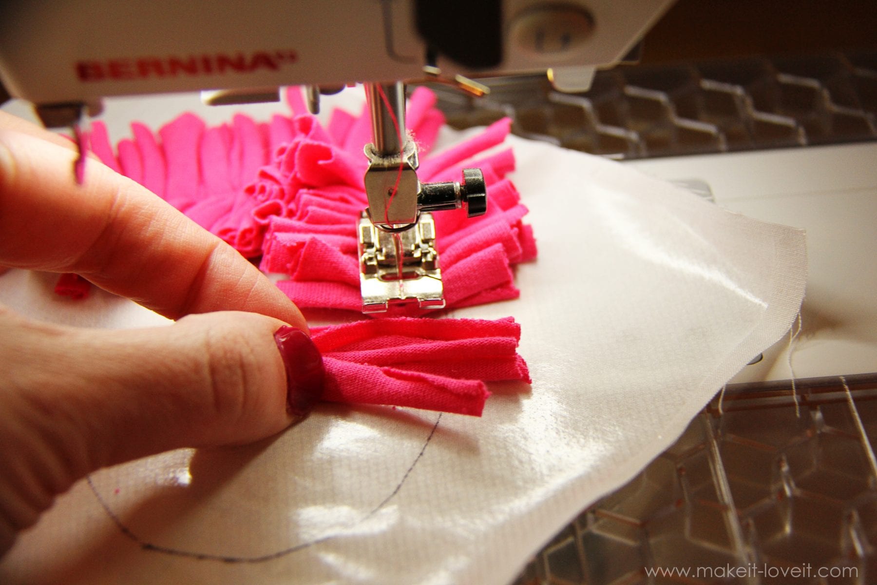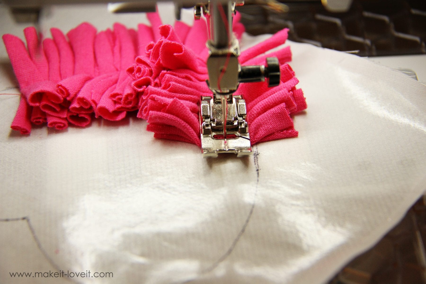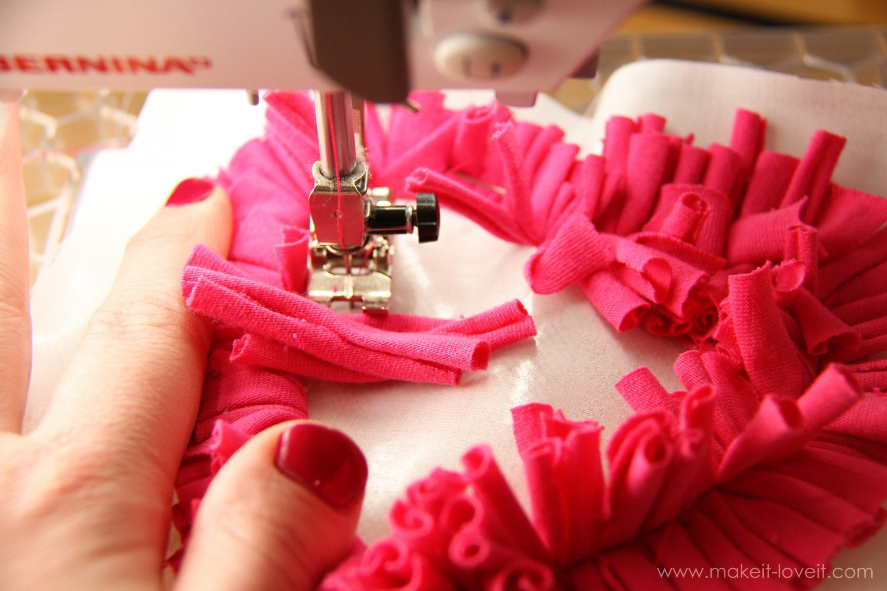 Then place about 3-4 of your little strips under the sewing machine needle at a time and sew them to the inside of the heart.  Make sure to sew those little pieces right down the center, keeping your needle about a 1/2 inch away from the pen mark of the heart that you drew.
