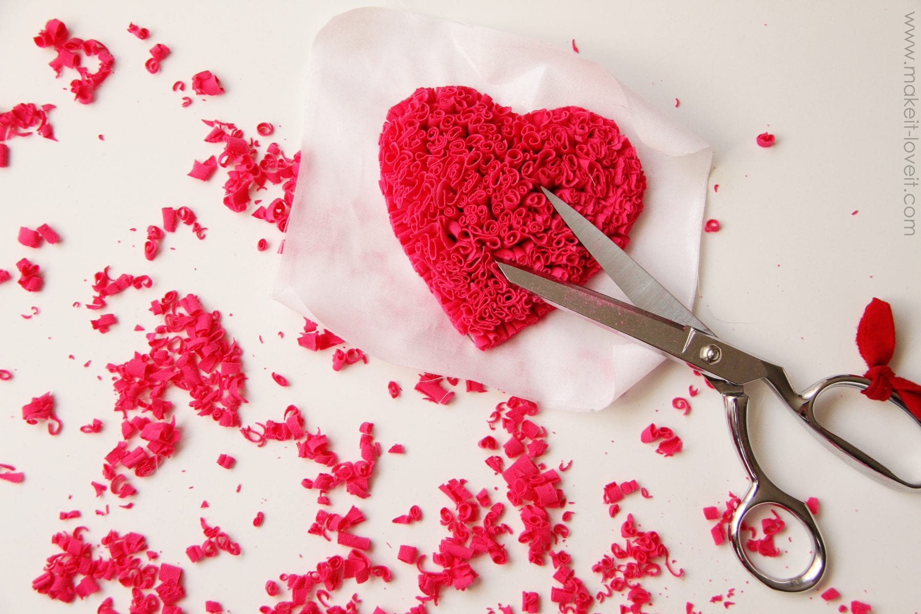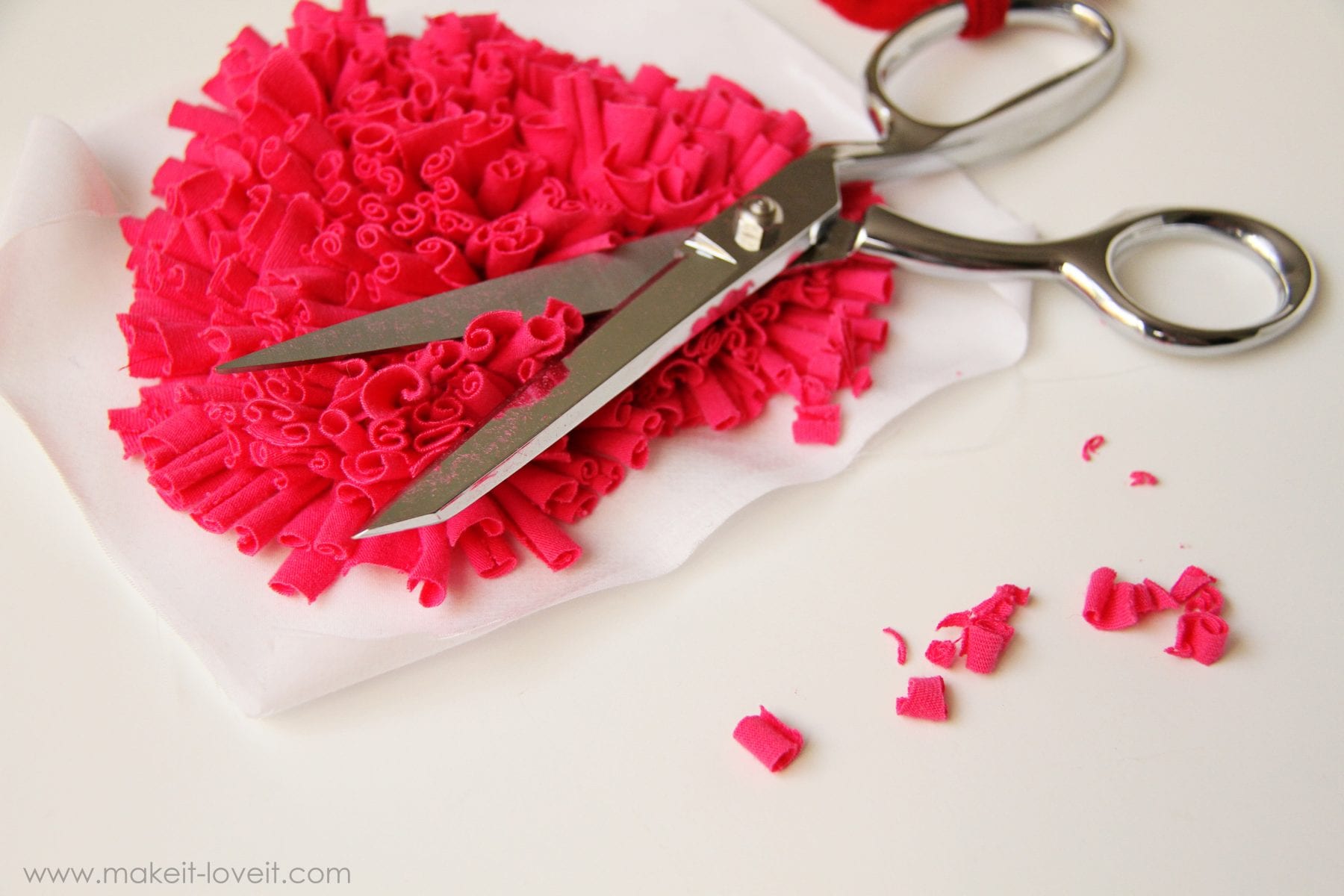First things first, cut out your dress pieces from an old women’s jersey knit Tshirt…..using the old collar and hem of the shirt as the collar and hem for your new dress, if you can. (Need more info on making your own dress? Click here.) Or you can also add this shaggy heart to a dress/shirt that you already have.Â