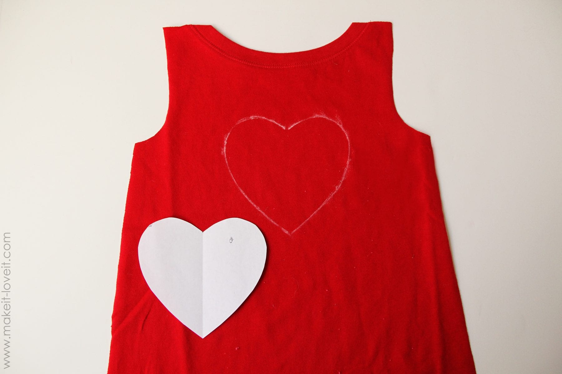 Then I used the same paper heart to draw a heart onto the front dress piece (or yours may be a shirt) with chalk.