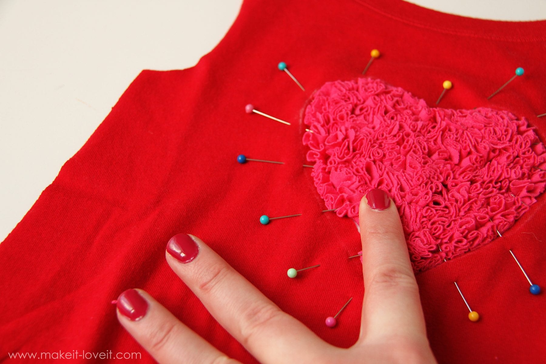 Then poke the heart through from the back side of the dress/shirt front.  Tuck the edges of the dress between the little strips and the base layer beneath the strips.  Pin in place.  (You will probably have to tuck a little bit, then pin, then tuck a bit more, and then pin more.  It takes a little manipulating to get it right where you want it.)