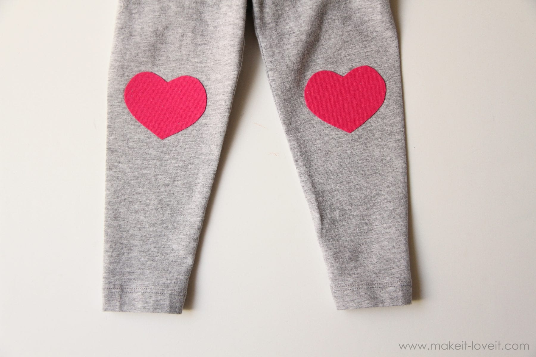 Iron the hearts onto the knee section of the leggings.  (You may need to try them on your girl to get the placement right.)