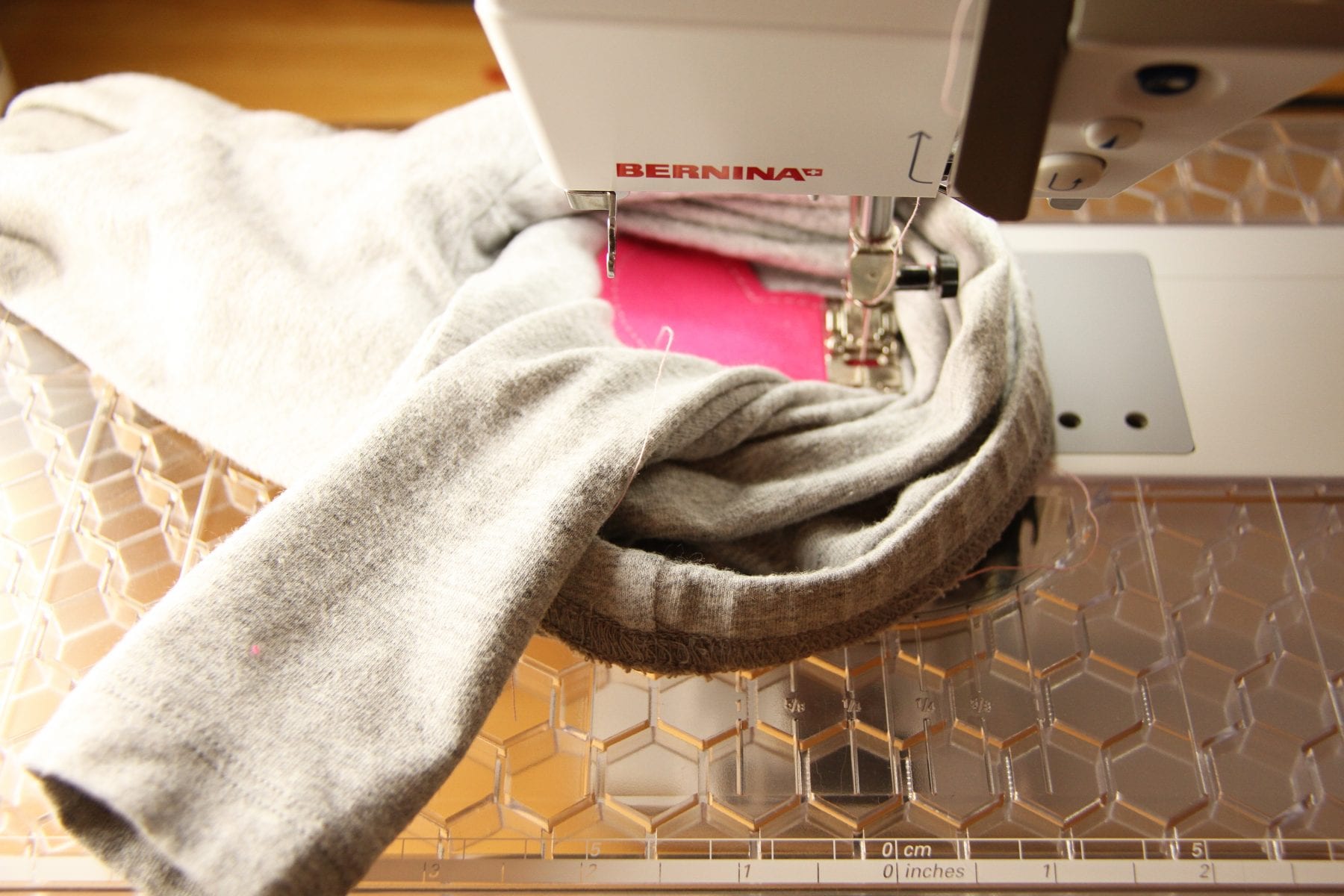 Then slide it under the needle and sew the 3 hearts just like shown above.  Now you’ll have to turn the pants inside out and resew that inner leg seam, using a zig-zag stitch (or serger) so that the leggings will still stretch.