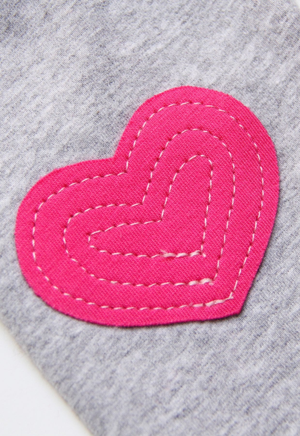 Open the pants from the waist and slide the pants under the needle until you just have the one layer of the legging fabric underneath the needle where the knee is at, while the rest of the fabric is pushed out of the way of the needle.  Then sew around the perimeter of the heart, about an 1/8 of an inch from the outer edge of the heart.  Then sew another 2 hearts inside of the first, gradually getting smaller with each heart.