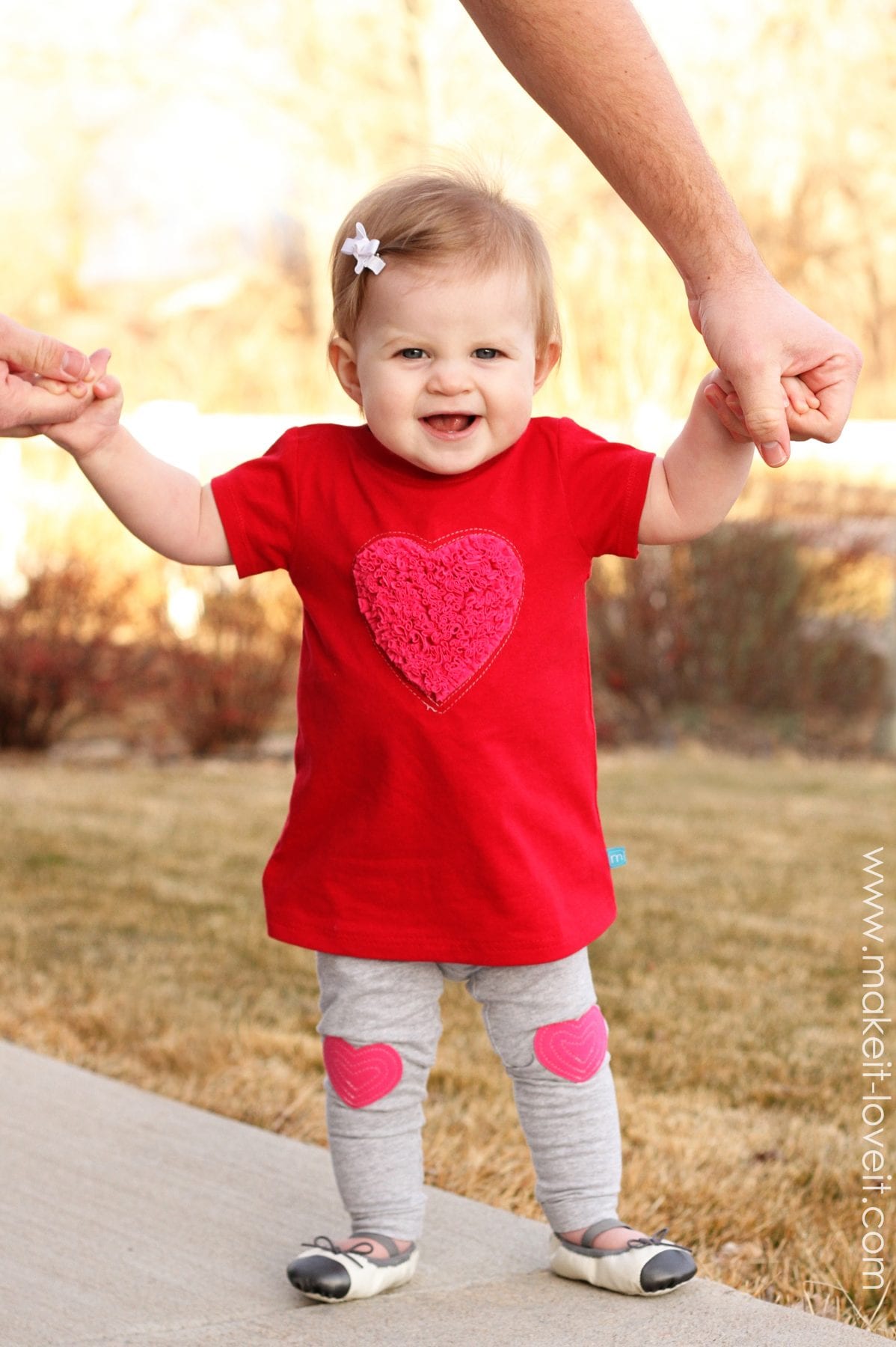 This little outfit was inspired by some shag rugs I was looking at the other day online.  (You know, a nice full and fluffy one like this one.)  Haha……..I know, pretty random.  But I wanted a nice 3D affect on Baby Girl’s Valentine shirt.  So when I saw the soft shaggy rugs, the two ideas merged.  And then matched that with some little heart knee-pad leggings.  Perfect for my little crawler.