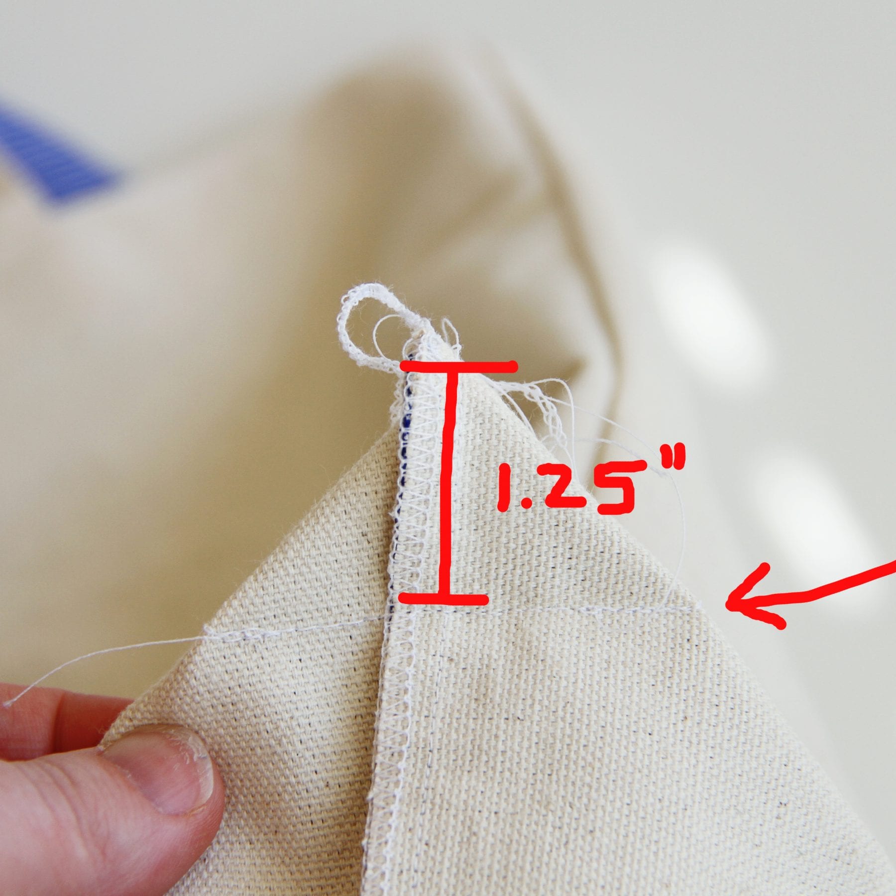 The squared off bottom for my tote isn’t huge. After folding the corner the other way (again, more on that here), I measured down 1.25 inches and then sewed a seam straight across. Now, serge or trim and zig-zag the raw edges.