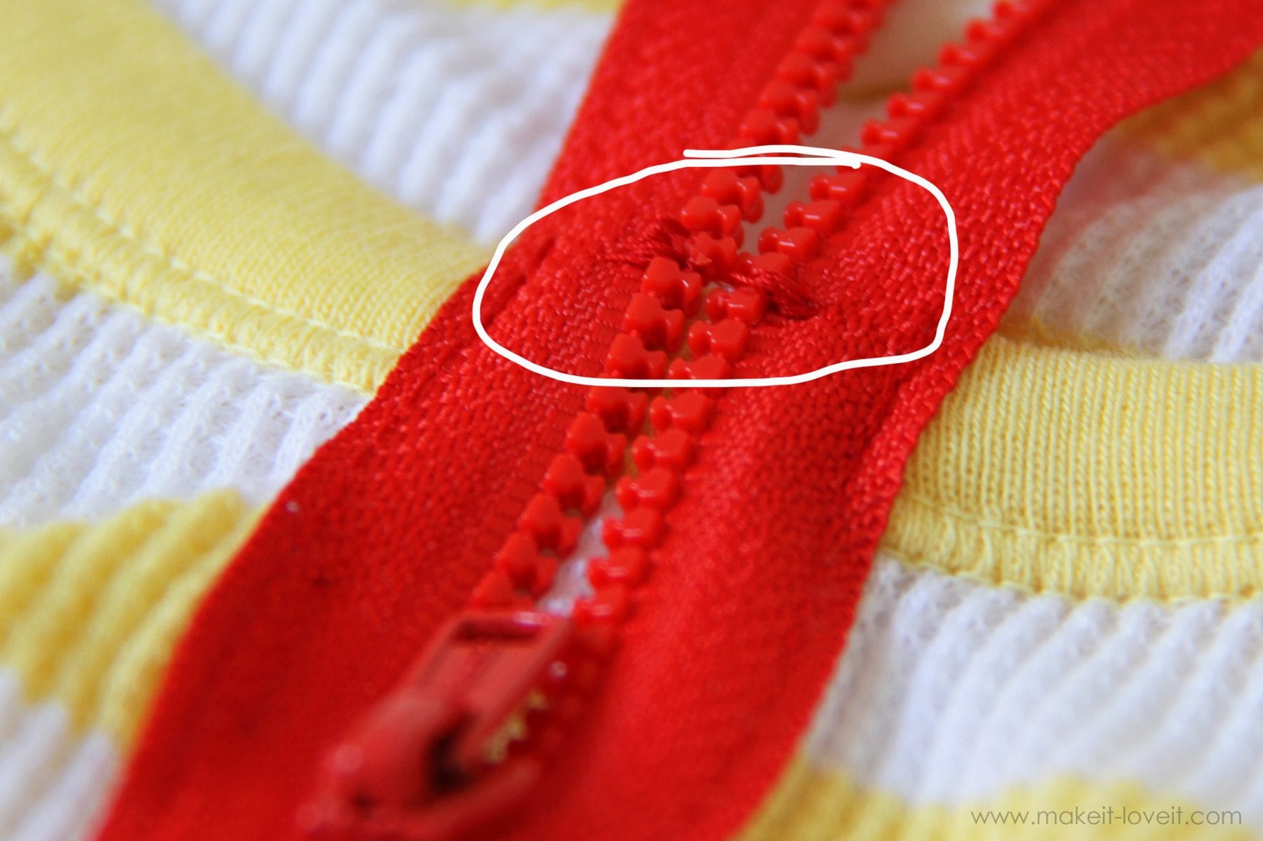 Because the zipper is just a bit too long, you’ll need to cut it off. But first, while the zipper pull is down at the bottom of the shirt and out of the way, you need to sew little stops at the top of the zipper……so that the zipper will stop at the top of the shirt. You will make stitches on each side of the zipper, right between two of the teeth so that the pull can’t go past it. To do so, put your sewing machine on the zig-zag stitch and change your stitch length to zero. This will make a zig-zag stitch without it moving forward at all. Push on the foot pedal and allow the thread to sew back and forth to create a bump of thread.